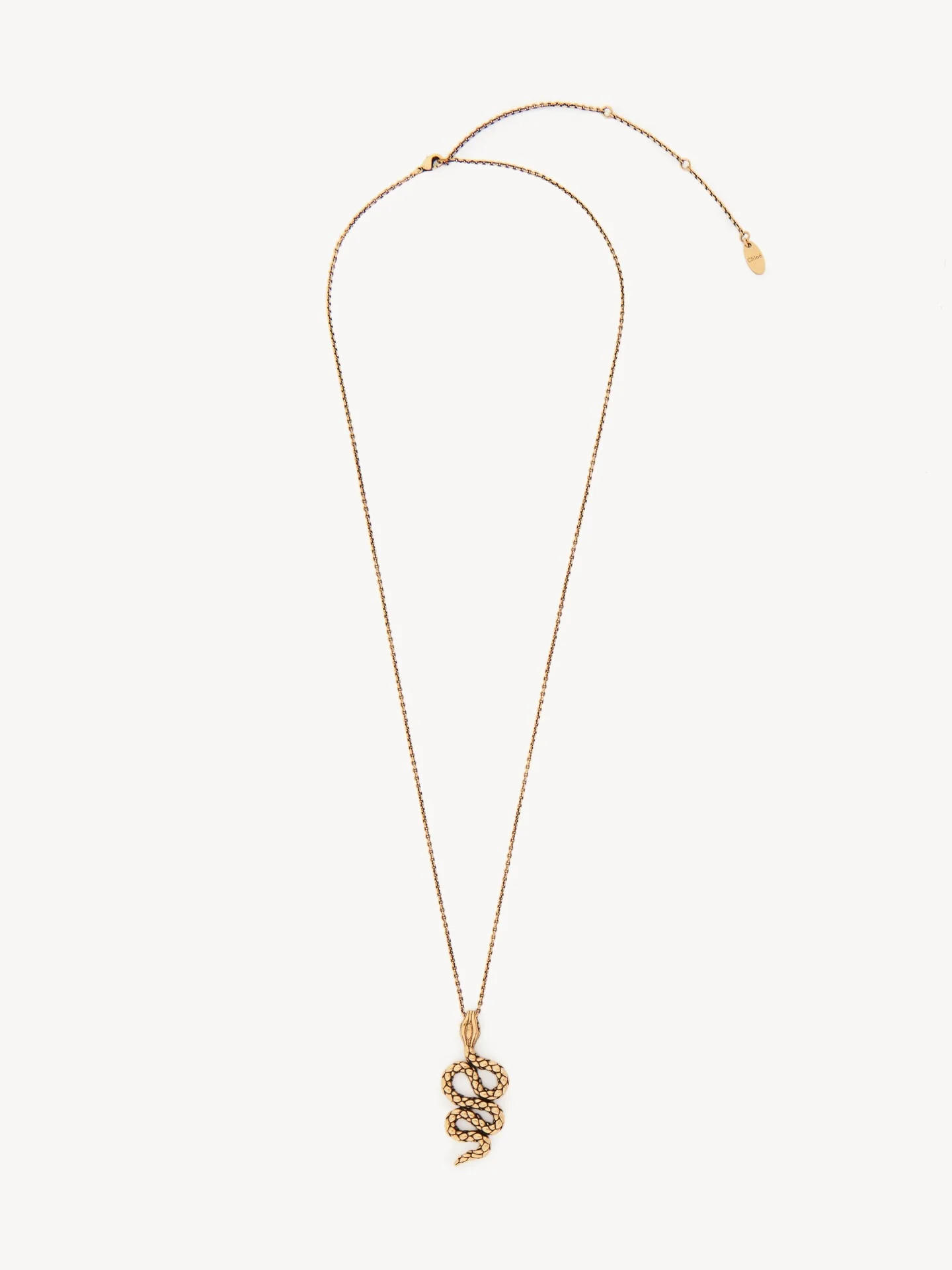 DESCRIPTION Chloe Snake pendant necklace inspired by embroidery on an archival Chloe dress. Small scales on the pendant create depth, while the coiled shape and refined snake head make a sophisticated statement. A mix of gold and black tones creates texture. Layer it with other necklaces from the Maison's jewelry collection for a strong statement. PRODUCT DETAILS Pendant necklace in 100% brass - One size only - Adjustable length - Chloe logo engraving Color: Vintage Gold Item code: CHC24WFO73CB79DC CARE INSTRUCTIONS To ensure this item's quality and longevity, wear it regularly and avoid exposure to direct sunlight and heat. Avoid impact, and contact with water, perfume or chlorine. Store your jewel in its pouch and box when not in use.