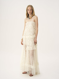 Thin-strap long dress in floral embroidered lace with ruffled trims and a fluid, gathered skirt. PRODUCT DETAILS Thin-strap long dress outer shell: 100% Silk Upper part: 82% Cotton, 18% Polyamide Lower part: 100% Polyamide Fit: fluid, long - The model is 5'10" (178 cm) and wears a prototype in size 36 - Long ruffle dress - Elastic ribbon at neckline - Thin straps knotted at shoulders Color: Iconic Milk Item code: CH25ARO40990107