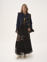 Gathered, tiered long skirt in organic silk georgette with a silk-mix lining, featuring lace inserts at the center and hem. Fabric-covered buttons detail the left side. PRODUCT DETAILS Tiered long skirt outer shell: 100% Silk Lining: 68% Acetate fiber, 32% Silk Main lacework: 57% Polyamide, 43% Viscose Secondary lacework: 83% Polyamide, 17% Viscose Fit: fluid, long - The model is 5'10" (178 cm) and wears a prototype in size 36 - Long silk skirt - Fabric-covered buttons at left side Organic silk manufacturing restricts the use of pesticides, insecticides or harsh chemicals and incorporates methods that respect biodiversity, improve soil quality and reduce water consumption. This product was made by Marie Helene Couture, a long-standing partner of Chloe based in Morlaas, France. Marie Helene Couture excels in the specialized technique of couture "flou." Their expertise aligns with the rigorous standards set by the "metiers de la mode, vetement flou" certification, ensuring a high level of professional aptitude in this delicate and skilled art form. Color: Black Item code: CH25AJU06117001