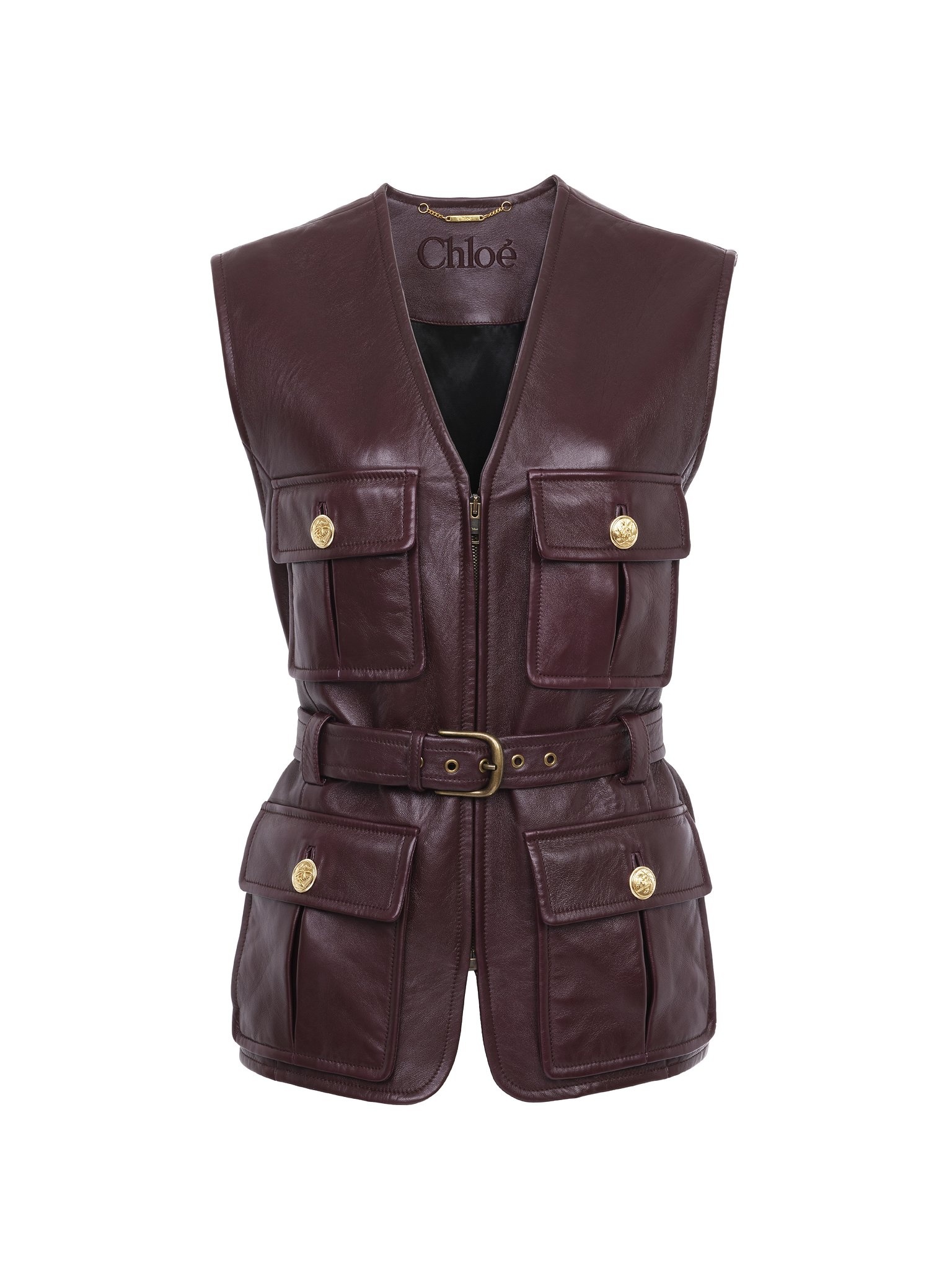 Belted utilitarian vest in soft lambskin, featuring a V-neckline, bellows pockets and gold-tone military buttons. PRODUCT DETAILS Utilitarian vest main material: 100% Lambskin Main lining: 62% Viscose, 38% Cotton Pocket lining: 100% Cotton Fit: straight, sleeveless - The model is 5'10" (178 cm) and wears a prototype in size 36 - Sleeveless leather jacket - Front zipper - Buckled leather belt - Chest & front pockets with gold-tone metal buttons To make this product, Chloe worked with Leather Working Group (LWG) certified leather manufacturers. LWG certifies tanneries based on their water and energy usage, management of chemicals, solid waste, and wastewater. Color: Crafty Brown Item code: CH25ACV0420427M