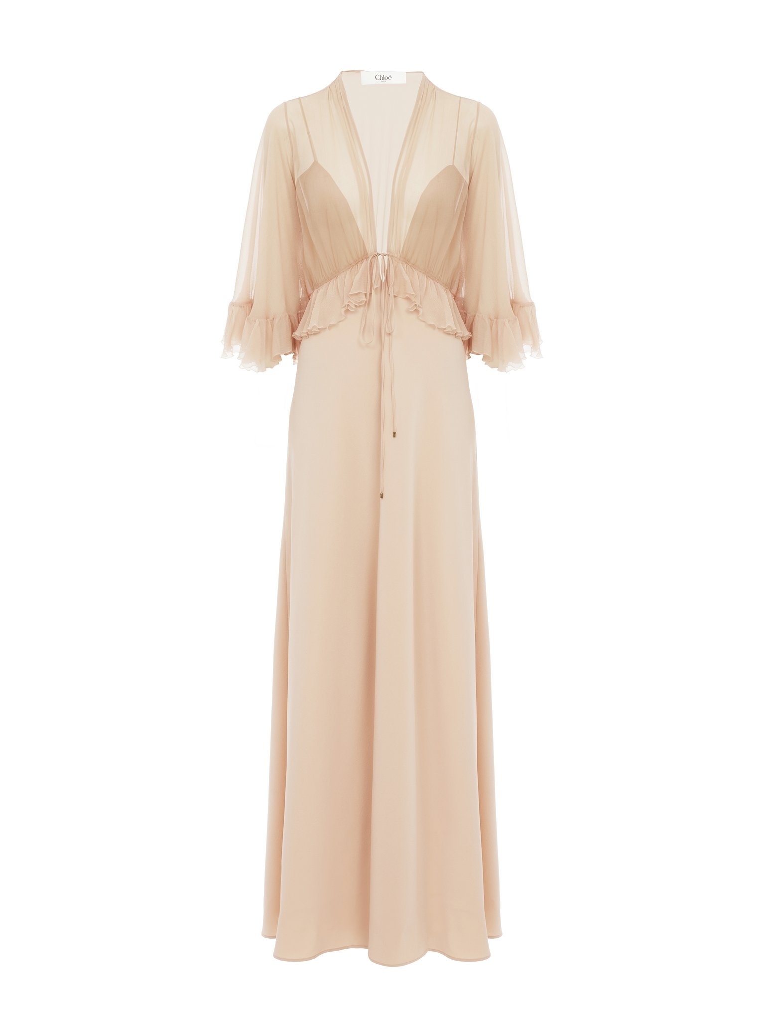 Fluid V-neck long dress in washed crepe satin with gathered details, ruffled trim and dangling ties finished with gold-toned metal tips. PRODUCT DETAILS V-neck long dress upper part: 100% Silk Lower part: 75% Acetate fiber, 20% Silk, 5% Polyamide Separate lining: 68% Acetate fiber, 32% Silk Fit: long, fluid - The model is 5'10" (178 cm) and wears a prototype in size 36 - Festive long dress - Side zipper - Ties with metal tips Care: dry cleaning only This product was made in collaboration with Akanjo, a certified WFTO supplier. Akanjo is a social enterprise located in Madagascar that places equal pay and employees' health & wellbeing at the core of their priorities. A long-standing partner of Chloe for 15 years, Akanjo is also committed to training and promoting craftsmanship. Color: Clay Pink Item code: CH25SRO263556H9