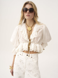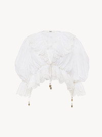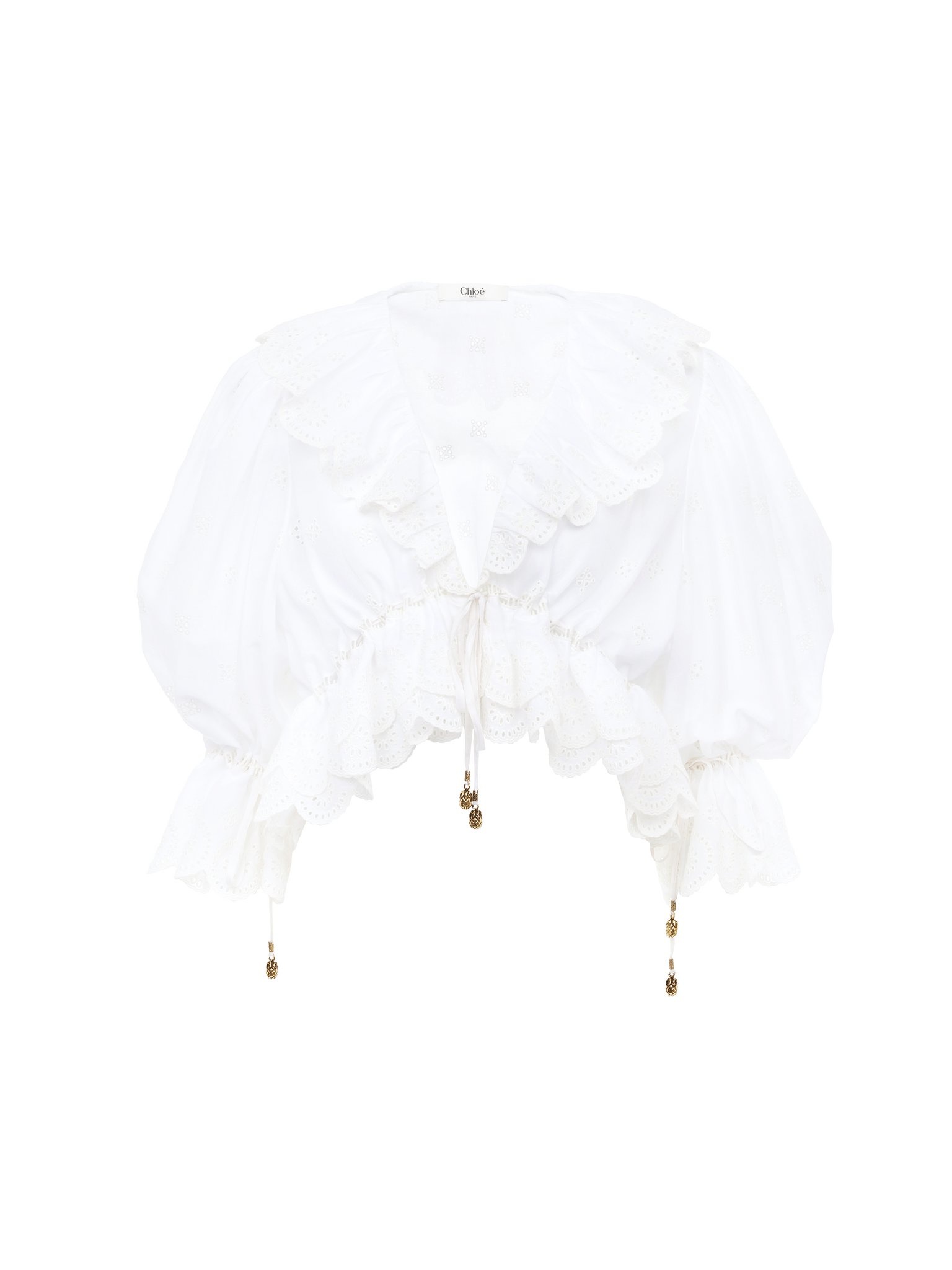 Ruffle top in organic cotton voile with floral broderie anglaise, a deep V-neck, flouncy trims and dangling ties with gold-tone metal tips and pineapple charms. PRODUCT DETAILS V-neck ruffle top outer shell: 100% Cotton Embroidery thread: 80% Cotton, 20% Polyester Fit: gathered - The model is 5'10" (178 cm) and wears a prototype in size 36 - Long-sleeve top - Drawstring waist & cuffs with hammered metal tips & gold-tone pineapple charms An organic cotton farming system sustains the health of soils, ecosystems and people by eliminating the use of toxic and persistent organic pollutants and increasing water conservation. Color: Iconic Milk Item code: CH25AHT47993107