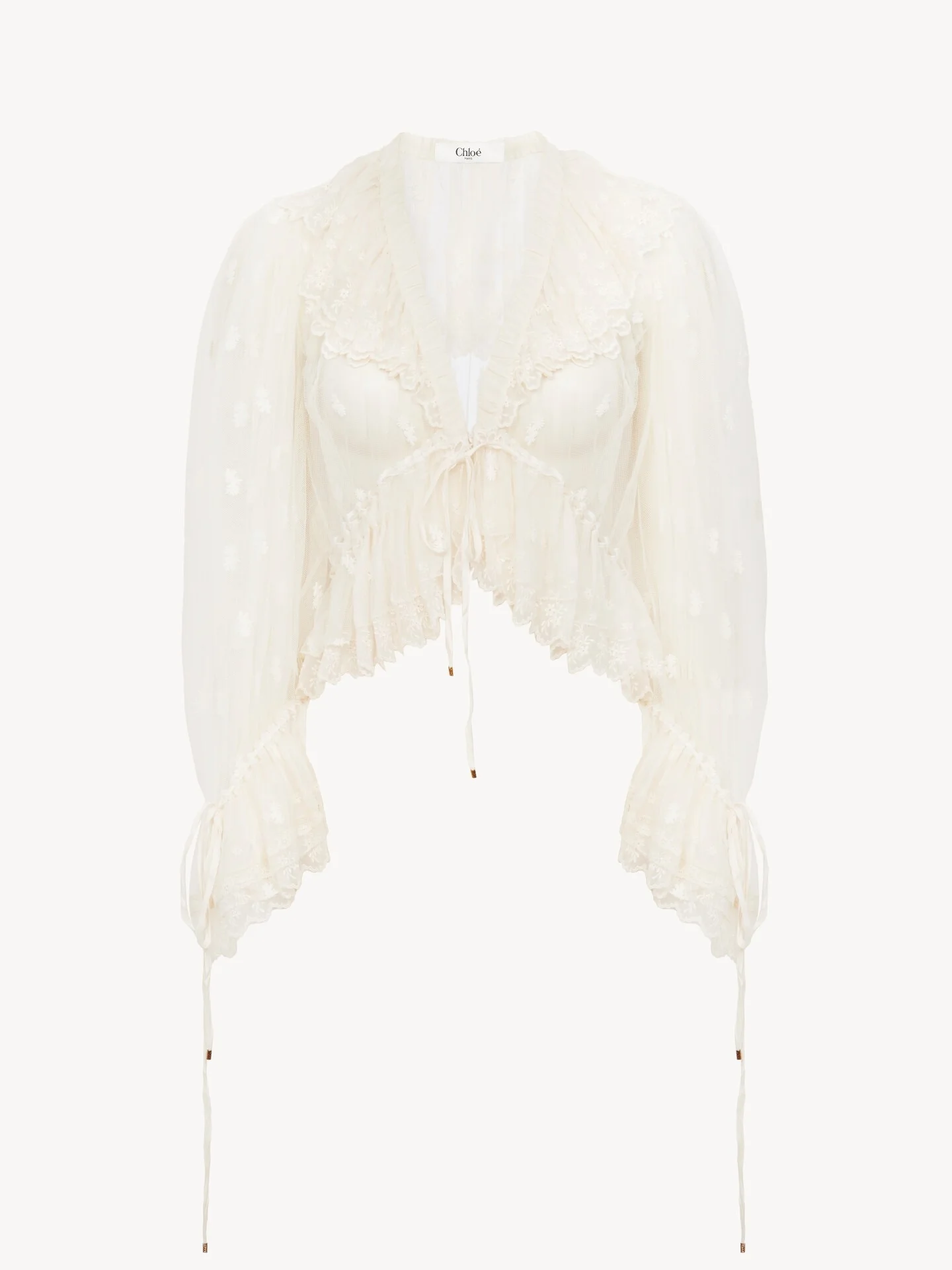 DESCRIPTION V-neck ruffle top in embroidered lace inspired by the Maison's heritage. The gathered silhouette features ruffle trims and drawstring ties with gold-tone metal tips. PRODUCT DETAILS V-neck ruffle top outer shell: 100% Polyester Braid: 53% Polyester, 47% Silk Collar: 100% Silk Buttons: 100% Mother-of-pearl Fit: fluid - The model is 5'10" (178 cm) and wears a prototype in size 36 - White lace top - Mother-of-pearl buttons at front - Drawstring ties with metal tips Care: dry cleaning only This product was made in collaboration with Akanjo, a certified WFTO supplier. Akanjo is a social enterprise located in Madagascar that places equal pay and employees' health & wellbeing at the core of their priorities. A long-standing partner of Chloe for 15 years, Akanjo is also committed to training and promoting craftsmanship. This item releases plastic microfibers into the environment when washed. Color: Whisper White Item code: CH25UHT26099113 CARE INSTRUCTIONS To preserve the integrity of your garment, please refrain from washing, entrusting its care to professional cleaning services for optimal maintenance. This garment cannot withstand any bleaching agent. To maintain its shape, gently iron this garment at a maximum sole plate temperature of 110°C, taking care to avoid any harsh pressure while ironing. Entrust this garment to a specialist for mild cleaning with tetrachloroethylene and solvent F, ensuring its delicate nature is maintained with the most care. To maintain its delicate nature, do not wet clean this garment. To best preserve its form and texture, please do not tumble dry this garment. TRACEABILITY Better traceability is central to improving our materials as well as social and environmental practices. Dyeing: France Weaving: France Manufacturing : Madagascar