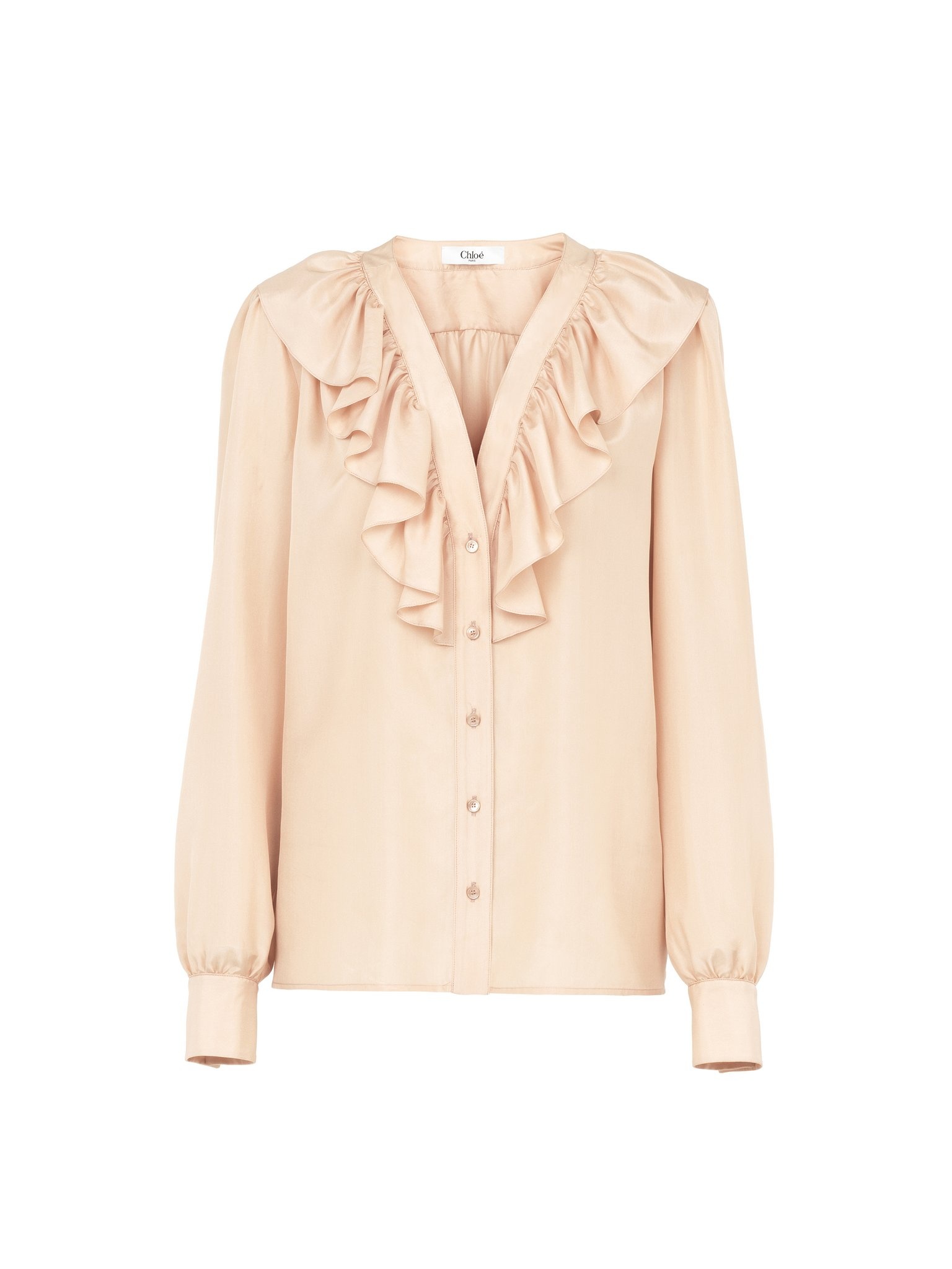 V-neck ruffled blouse in soft silk habotai with gathered details and flounces along the neckline. PRODUCT DETAILS Ruffled blouse outer shell: 100% Silk Buttons: 100% Mother-of-pearl Fit: fluid - The model is 5'10" (178 cm) and wears a prototype in size 36 - V-neck silk blouse - Mother-of-pearl buttons through front & at cuffs Care: dry cleaning only This product was made in collaboration with Akanjo, a certified WFTO supplier. Akanjo is a social enterprise located in Madagascar that places equal pay and employees' health & wellbeing at the core of their priorities. A long-standing partner of Chloe for 15 years, Akanjo is also committed to training and promoting craftsmanship. Color: Biscuit Pink Item code: CH25UHT674896H7