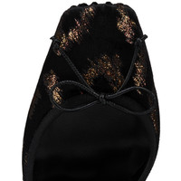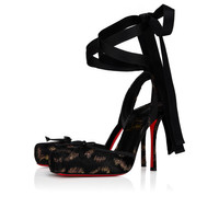 The strikingly elegant Cassia Lace Up pump is inspired by ballet shoes. This Maison Christian Louboutin shoe is crafted from black velvet with an animal print, hand-decorated with gold and copper sequinned threads, and set on a 100 mm stiletto heel. A ribbon ankle tie and a small tone-on-tone bow enhance its delicate lines. Product information Reference: 3250509B872 Color: Black Material: 'Leo By Night' embroidered velvelt Heel Height: 100 mm