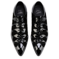 The sophisticated Circus lace-up shoe by Maison Christian Louboutin has a tapered silhouette. Set on a small square heel and featuring a pointed toe, it combines black patent calf leather and veau velours. This elegant model is characterized by its rounded panels on the top, inspired by the ruffles of a Harlequin costume. Product information Reference: 1260266BK01 Color: Black Material: Patent calf leather