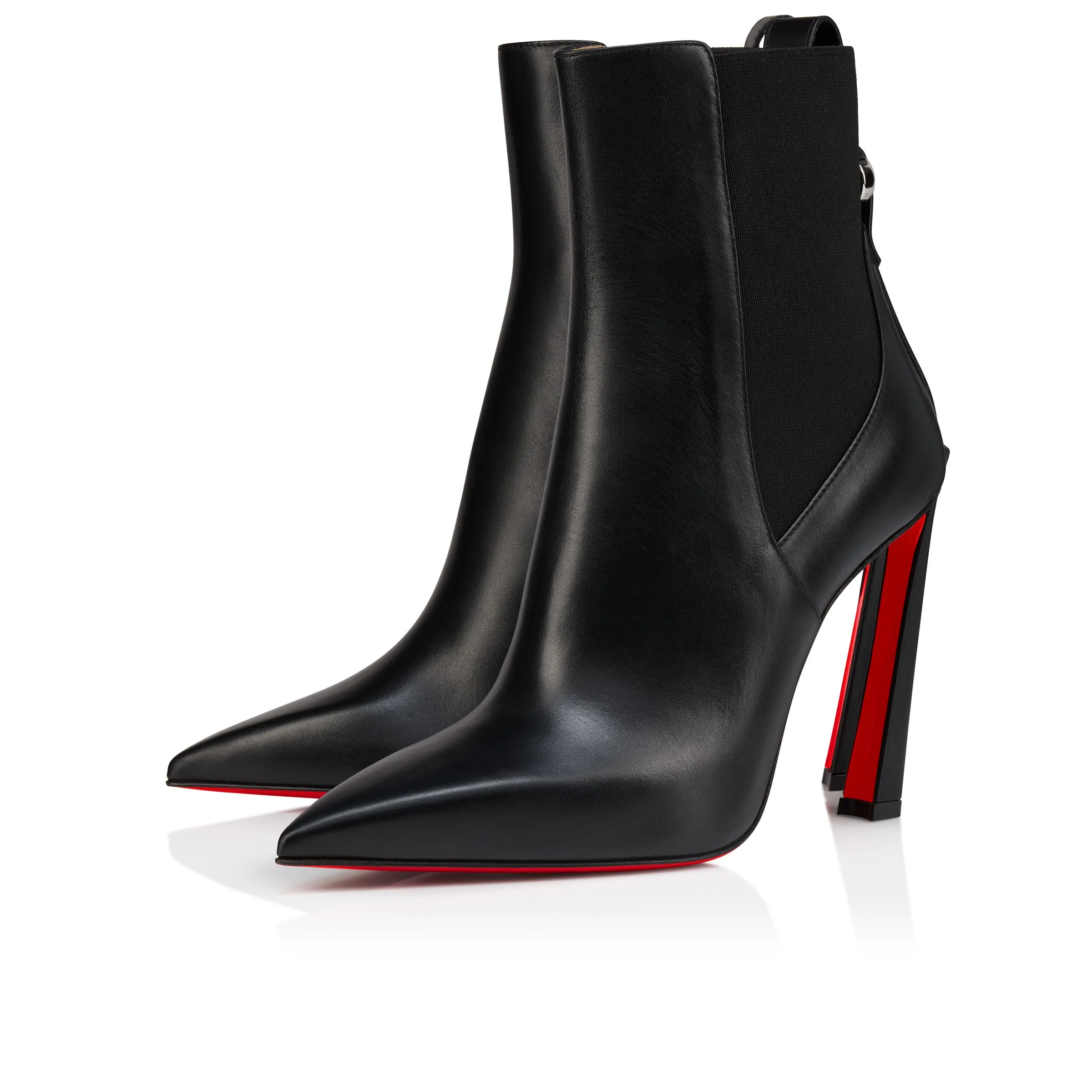 The Condodo ankle boot is a sophisticated model distinguished by its 100 mm beveled heel and its pointed toe. It is made entirely from calf leather in all-over black and features an elasticated band on its sides, making it easier to slip on. The loop at the back is trimmed with a metallic spike, a signature detail of Maison Christan Louboutin. Product information Reference: 3250534BK01 Color: Black Material: Calf leather Heel Height: 100 mm
