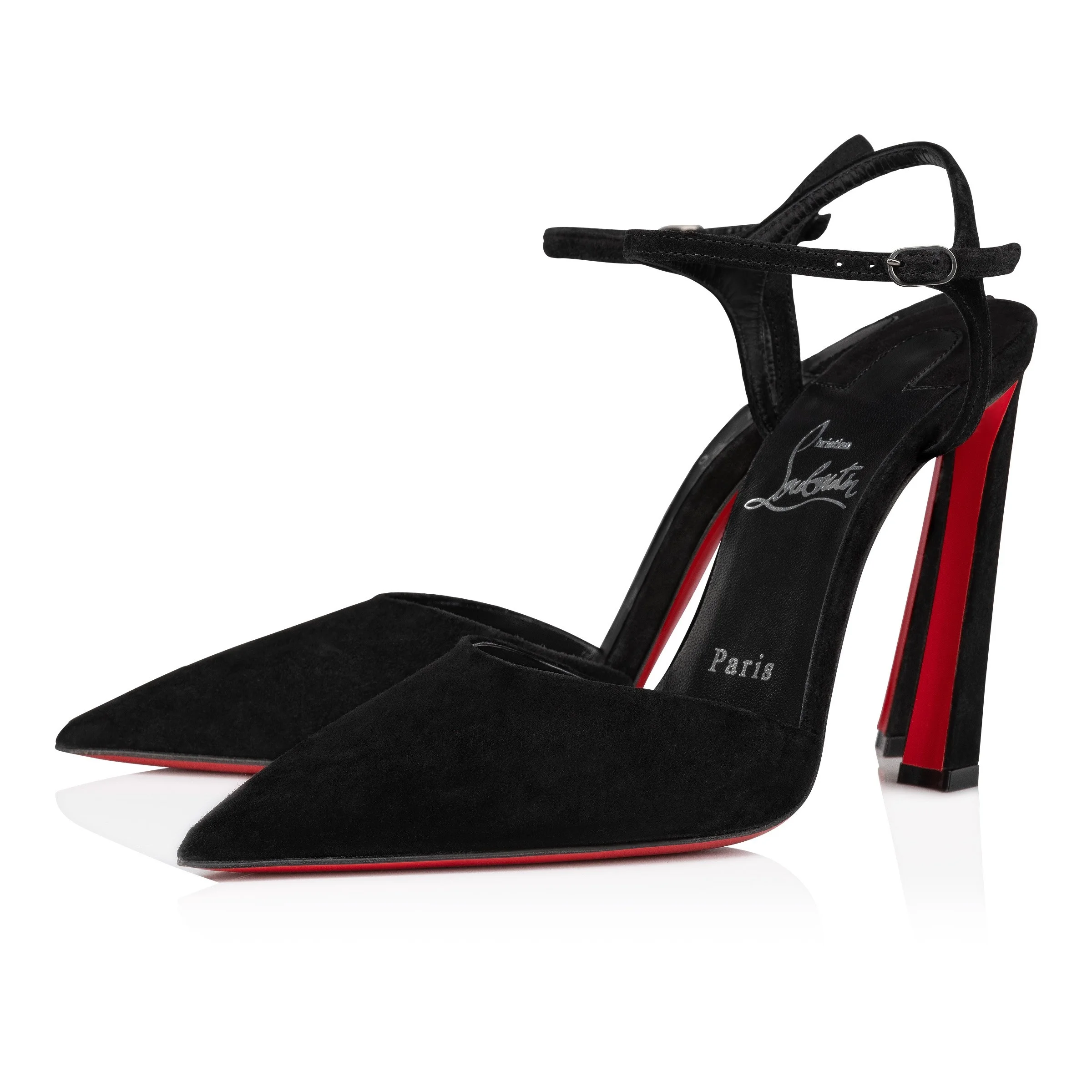 The Condora Riviera pump has a pointed toe like a bird's beak. This sophisticated style in black patent leather has a daring low-cut vamp revealing the foot. It has a 100 mm slanted heel and a slender ankle strap, showcasing Maison Christian Louboutin's innovative creativity. Product information Reference: 3240815B439 Color: Black Material: Veau velours Heel Height: 100 mm