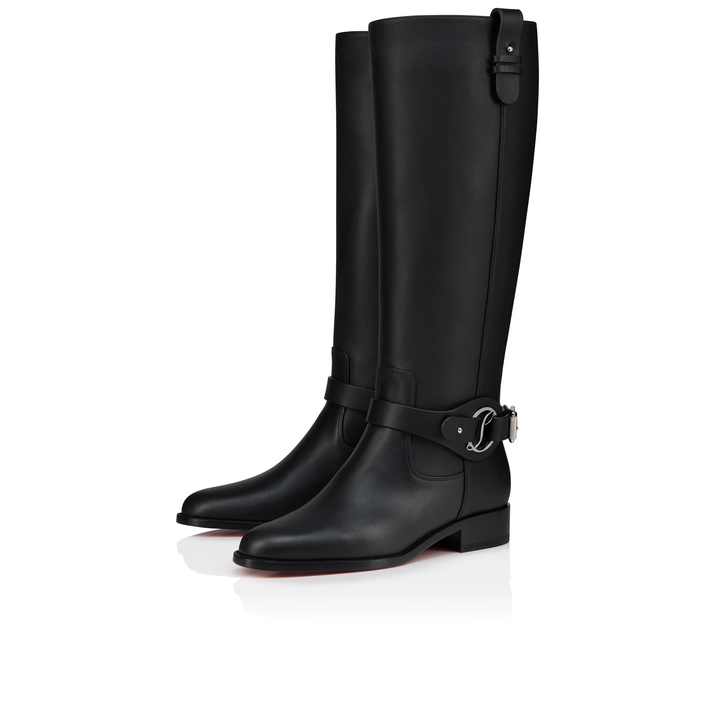 Maison Christian Louboutin's Dianouchette Botta tubular boot features a round toe and is crafted in black calf leather. This model is easy to put on thanks to the two leather straps around the ankle, adorned with an iconic silver CL Mooncrest logo, pin and buckle. This long boot rises elegantly up the leg and is finished at the top with a leather side tab featuring a silver pin. Product information Reference: 1260052BK01 Color: Black Material: Calf leather