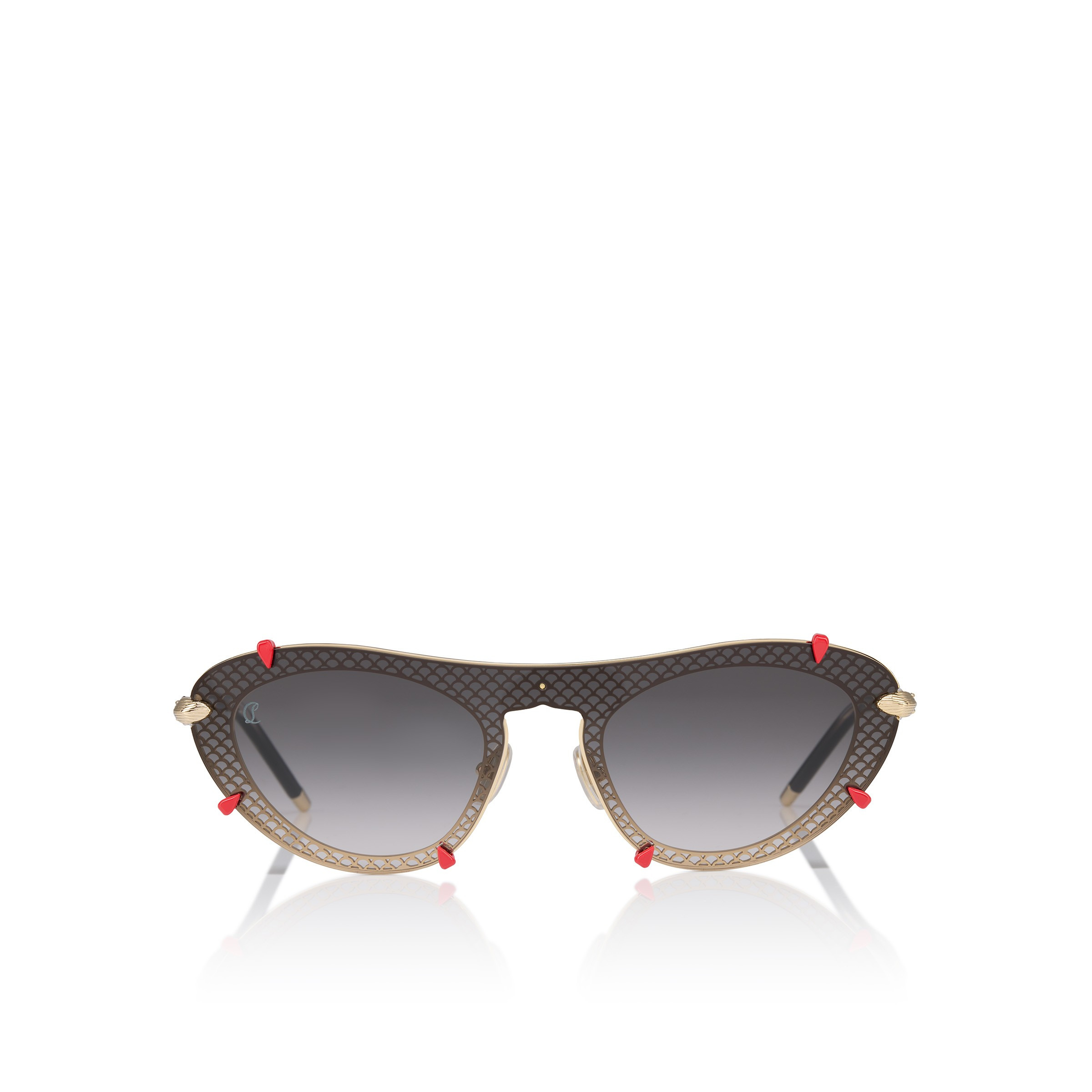 The Dolly LB0007 sunglasses feature an oval-shaped design that blends boldness and sophistication. This elegant metal version features an elaborately designed front, in which the full wraparound lens is embedded in the metal frame reproducing the brand's iconic palmette pattern. The red inserts at the corners add a signature touch recalling the iconic Christian Louboutin red soles. This model is made in a pale gold color with gradient smoke lenses. High-performance Zeiss lenses offering exceptional quality comfort and durability for Christian Louboutin collection. Made in Italy. Product information Reference: 1255349K195 Color: Gold Material: Metal Temple length: 135 mm Category of filtration: 2