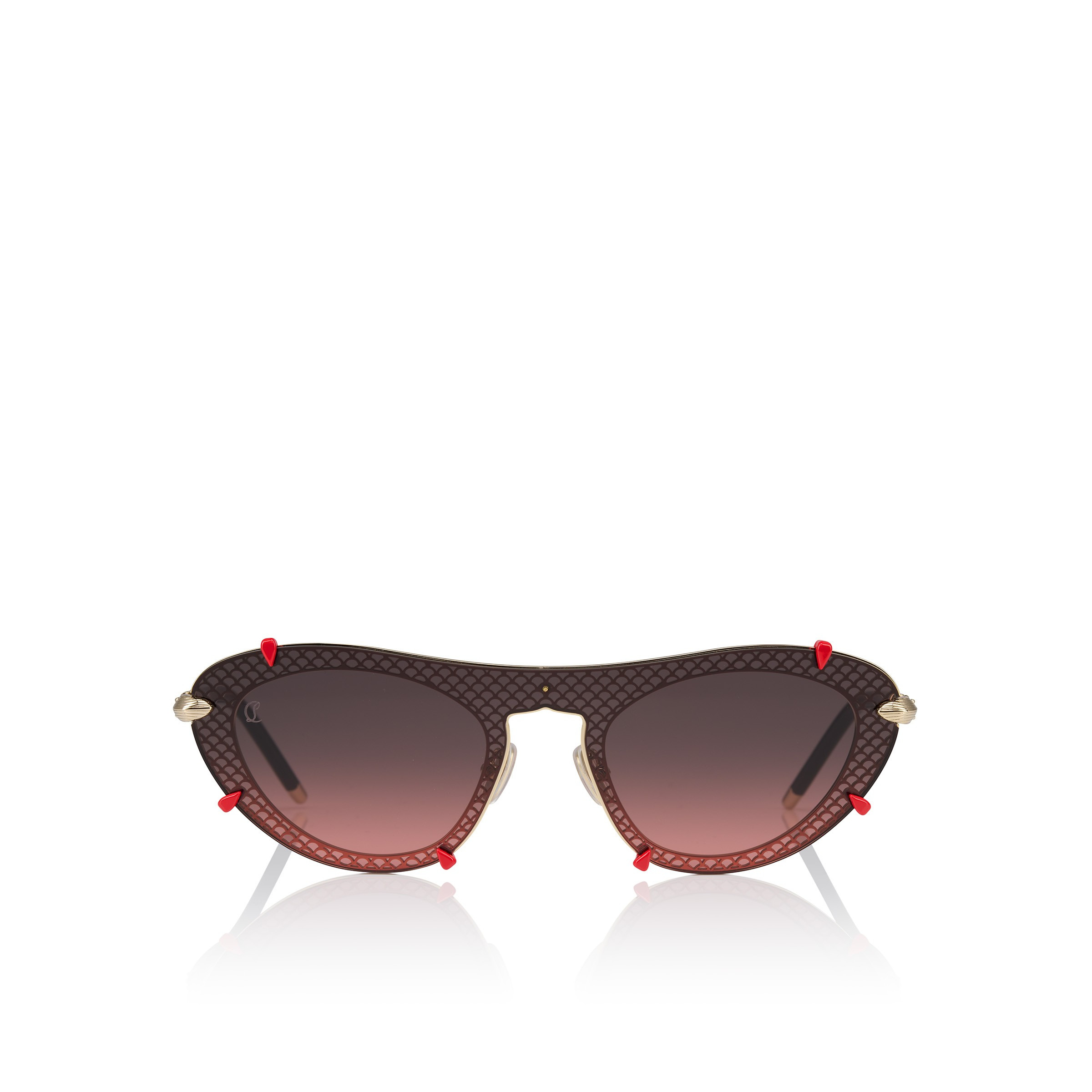 The Dolly LB0007 sunglasses feature an oval-shaped design that blends boldness and sophistication. This elegant metal version features an elaborately designed front, in which the full wraparound lens is embedded in the metal frame reproducing the brand's iconic palmette pattern. The red inserts at the corners add a signature touch recalling the iconic Christian Louboutin red soles. This model is made in a pale gold color with smoke gradient red lenses. High-performance Zeiss lenses offering exceptional quality comfort and durability in an exclusive color made only for Christian Louboutin collection. Made in Italy. Product information Reference: 1255349K194 Color: Gold Smoke Material: Metal Temple length: 135 mm Category of filtration: 3