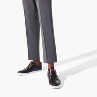 The F.A.V. Fique A Vontarde sneaker gives a modern twist to a 1980s tennis shoe, with a slip-on style and signature Maison Christian Louboutin details. An iconic grosgrain FAV label adorns the tongue of each sneaker. This model is crafted in classic Black calfskin leather for timeless appeal with a row of iconic glossy Silver spikes running each side of the tongue. Product information Material: Calf leather Color: Black Reference: 3200465BK01 Collection: Fall Winter 20