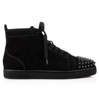 The Lou spikes is a classic 1980’s inspired Hi-top sneaker – a reworked version of the iconic Louis with the addition of Maison Christian Louboutin’s audacious signature spikes evenly hand-placed across the toe. This sophisticated model is crafted in Black suede and features, black laces, soles and edging; even the iconic spikes across the toe are Black, creating an understated effect. Product information Material: Leather Color: Black Reference: 1140458B049 Collection: Summer 14