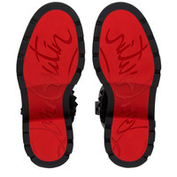 With its urban lines, the Marinetta Pyraclou boot is set on a notched sole. Featuring a square toe, it wraps the leg with its tubular silhouette made entirely from black waxed calf leather. It features a strap around the ankle and tonal spikes in the shape of a pyramid around the sole and on the strap, a signature detail from Maison Christian Louboutin. Product information Reference: 3250618BK01 Color: Black Material: Waxed calf leather