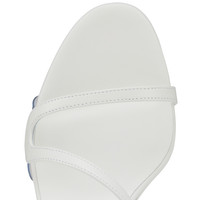 Maison Christian Louboutin's Rosalie is a striking sandal with a 55 mm kitten heel and an audacious slender strap that curves in a wave over the foot, elongating the leg and recalling the Christian Louboutin logo. This model is crafted Bianco white leather and PVC and finished with tonal lining for a summery appeal. Product information Reference: 1250951W302 Color: Bianco Material: Kid leather Heel Height: 55 mm
