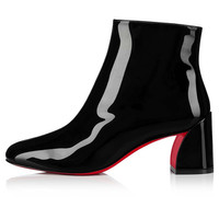 The elegant and sophisticated Turela ankle boot features irresistibly sleek lines. This timeless shoe is made from patent calfskin leather and is set on a rounded asymmetrical 55 mm heel. The colourway is black and it is fitted with a side zip. Tone-on-tone topstitching adds refined style to this Maison Christian Louboutin shoe. Product information Material: Patent calf leather Color: Black Reference: 1220071BK01 Heel height: 55 mm Collection: Summer 22