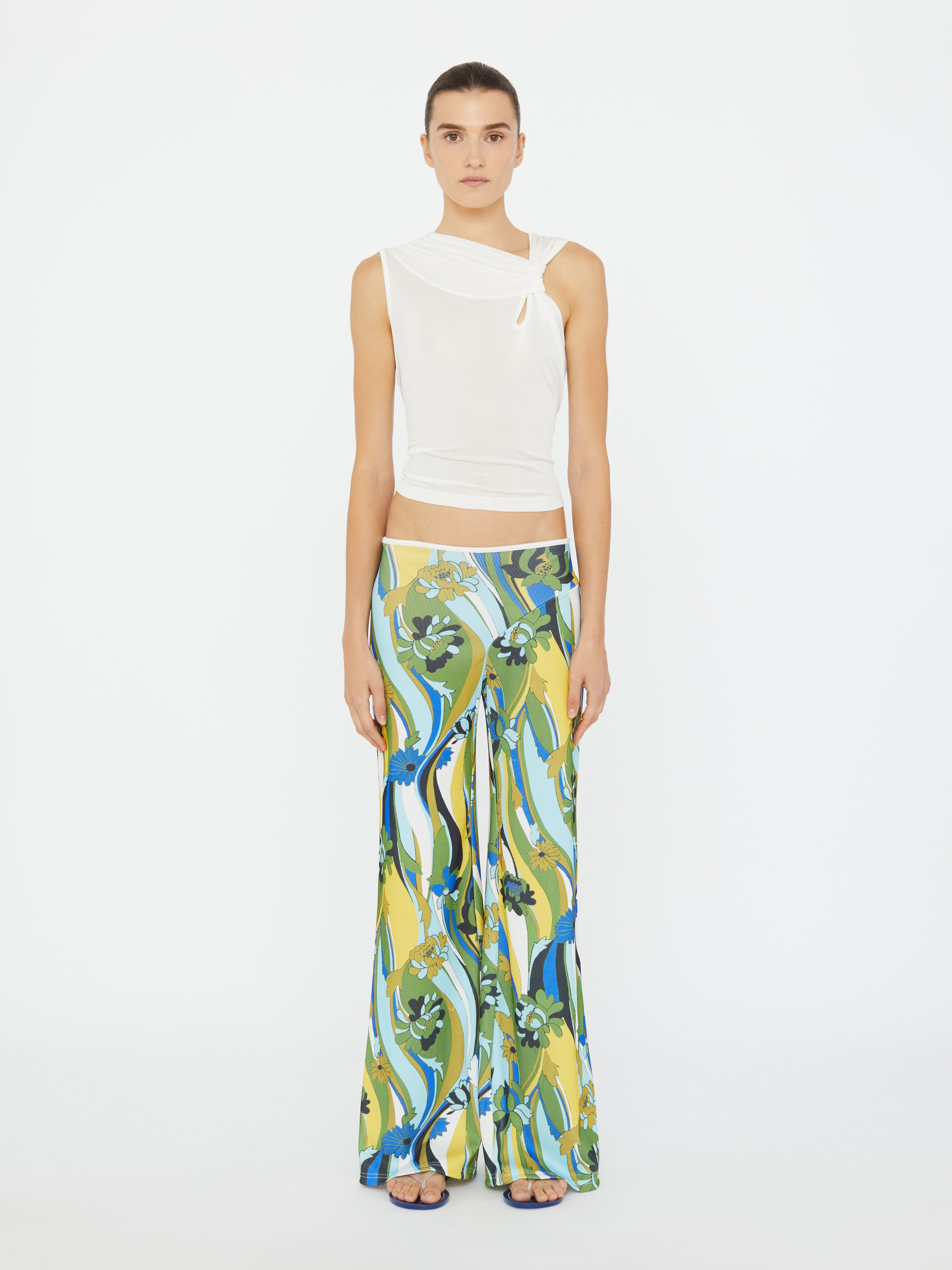 Crafted in fluid stretch jersey, the Acidic Floral Rib Pant features a fitted waist and wide-leg silhouette that moves with ease. A custom hibiscus wave print reimagines vintage surf motifs in saturated shades of citron, azure, and fern. Designed to sit low on the hip, pairs this style with a minimal tank or sheer rib knit for balance. - Fitted waist with wide-leg silhouette - Custom hibiscus wave print - Vintage surf-inspired floral motif - Low-rise fit designed to sit on the hip - Main: 96% Polyester 4% Spandex - Dry Clean Only Model is 180cm/5'11" and wears size AU 8 (US 4) AU sizing