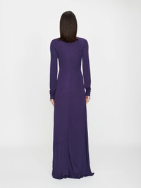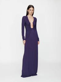 Cut in lightweight jersey, the silhouette falls to a floor-skimming hem. Featuring a plunging neckline framed by delicate gold hardware and gathered ruching centre. - Floor-length silhouette - Deep plunge neckline with signature gold ball hardware - Central ruched panel for a gathered effect - Long sleeve with slim fit through the arms - Lightweight stretch jersey for soft drape - Main: 100% Viscose - Hardware: 100% Zinc Alloy Model is 180cm/5'11" and wears size AU 8 (US 4) AU sizing