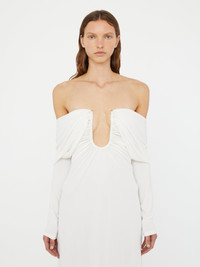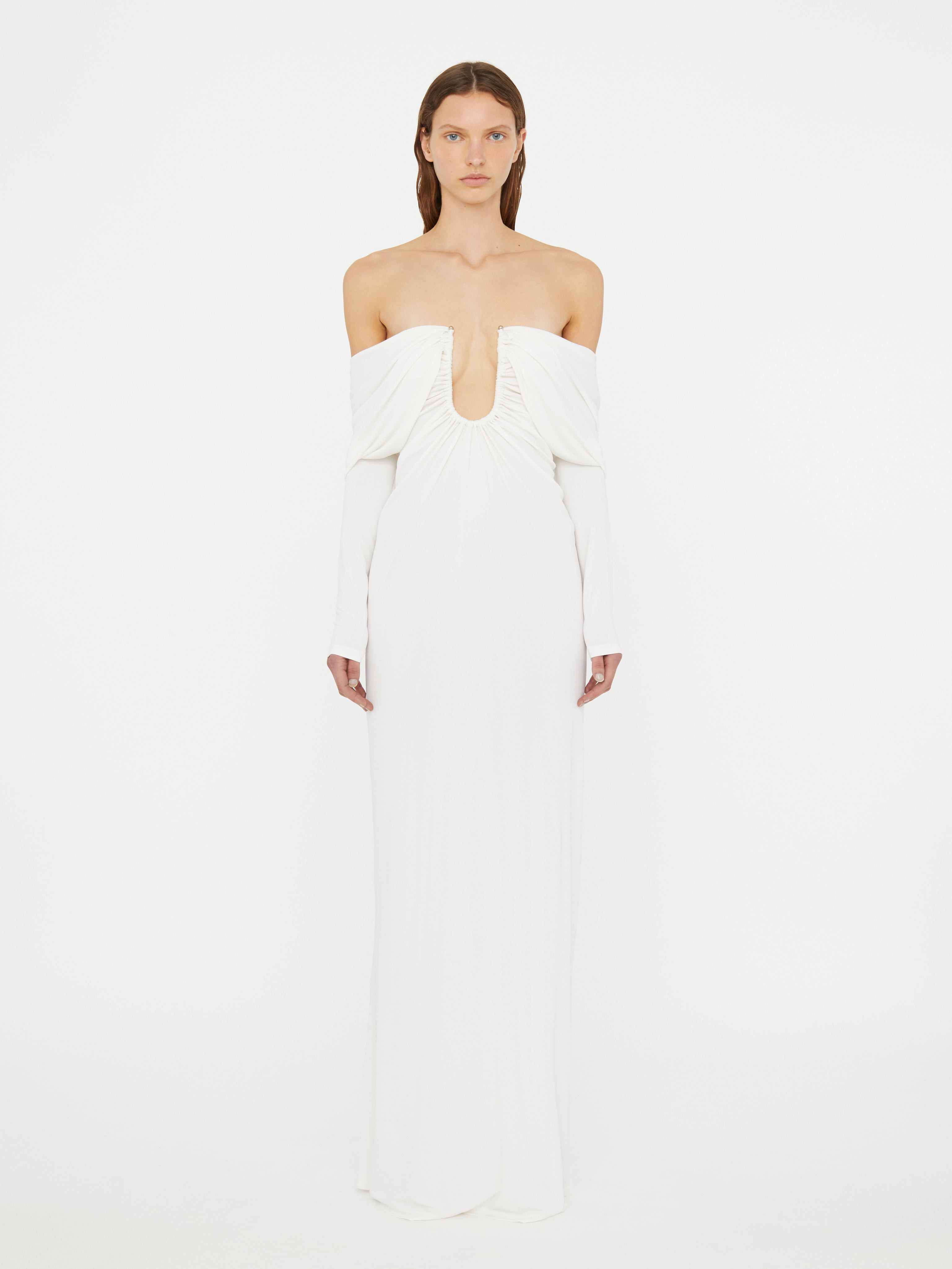 Evolved from the brands signature arced palm silhouette, sculptural hardware anchors a plunging neckline in this shawl gown. Crafted in fine interlock jersey that ruches and defines the waist. - Signature u prong hardware - Plunging neckline - Gathered ruche detailing - Slim fit at bust with internal tape - Maxi silhouette - Invisible back zipper - Slim fit bodice - True to size - 100% Viscose - Hardware: 100% Zinc Alloy Claire is 179cm/5'10.5" and wears size AU 8 (US 4) AU sizing