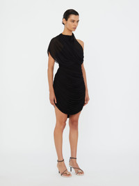 Adorned with bespoke natural glass hardware, the Beach Glass Circular Jersey Mini Dress is crafted in slinky jersey with a sheer georgette overlay, creating layered dimension and fluidity. Soft draping through the neckline contrasts the sculpted, ruched skirt, while a considered cutout under the arm draws the eye with subtle exposure. - Asymmetric draped silhouette - Ruched mini skirt - Beach glass hardware - Underarm cutout detail - Main: 71% Rayon 29% Polyester - Overlay: 95% Viscose 5% Elastane - Hardware: 100% Copper With Glass - Dry Clean Only Model is 180cm/5'11" and wears size AU 8 (US 4) AU sizing