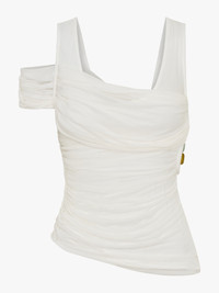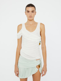 The Beach Glass Shawl Jersey Tank is designed with fluid draping across the neckline and bodice, anchored by sculptural glass hardware under the arm. The gathered overlay contrasts a clean tank base while a considered underarm cutout reveals the torso. - Asymmetric draped overlay - Underarm cutout detail - Beach glass hardware - Tank base with side seam contouring - Gathered detail through the waist - Main: 71% Rayon 29% Polyester - Overlay: 95% Viscose 5% Elastane - Hardware: 100% Copper With Glass - Dry Clean Only Model is 180cm/5'11" and wears size AU 8 (US 4) AU sizing