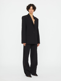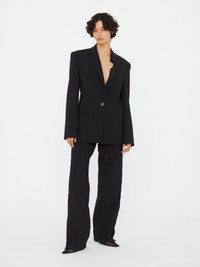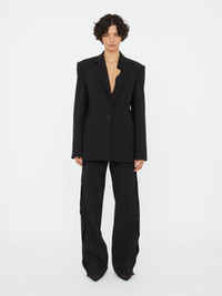 A classic tailored blazer disrupted by an organic cut-out detail along the lapel. Structured shoulders and a single-breasted front bring precision, while the asymmetric line introduces a subtle subversion - clean, architectural, and distinctly Esber. Style with the matching trouser or layered over skin for sculptural minimalism. - Tailored single-breasted blazer - Sculptural curved lapel detail - Structured shoulders with light padding - Single-button front closure - Welt pockets at waist and chest - Darted seams for a cinched silhouette - Fully lined - Main: 96% Wool, 4% Elastane - Lining: 100% Viscose - Dry Clean Only Model is 180cm/5'11" and wears size AU 8 (US 4) AU sizing