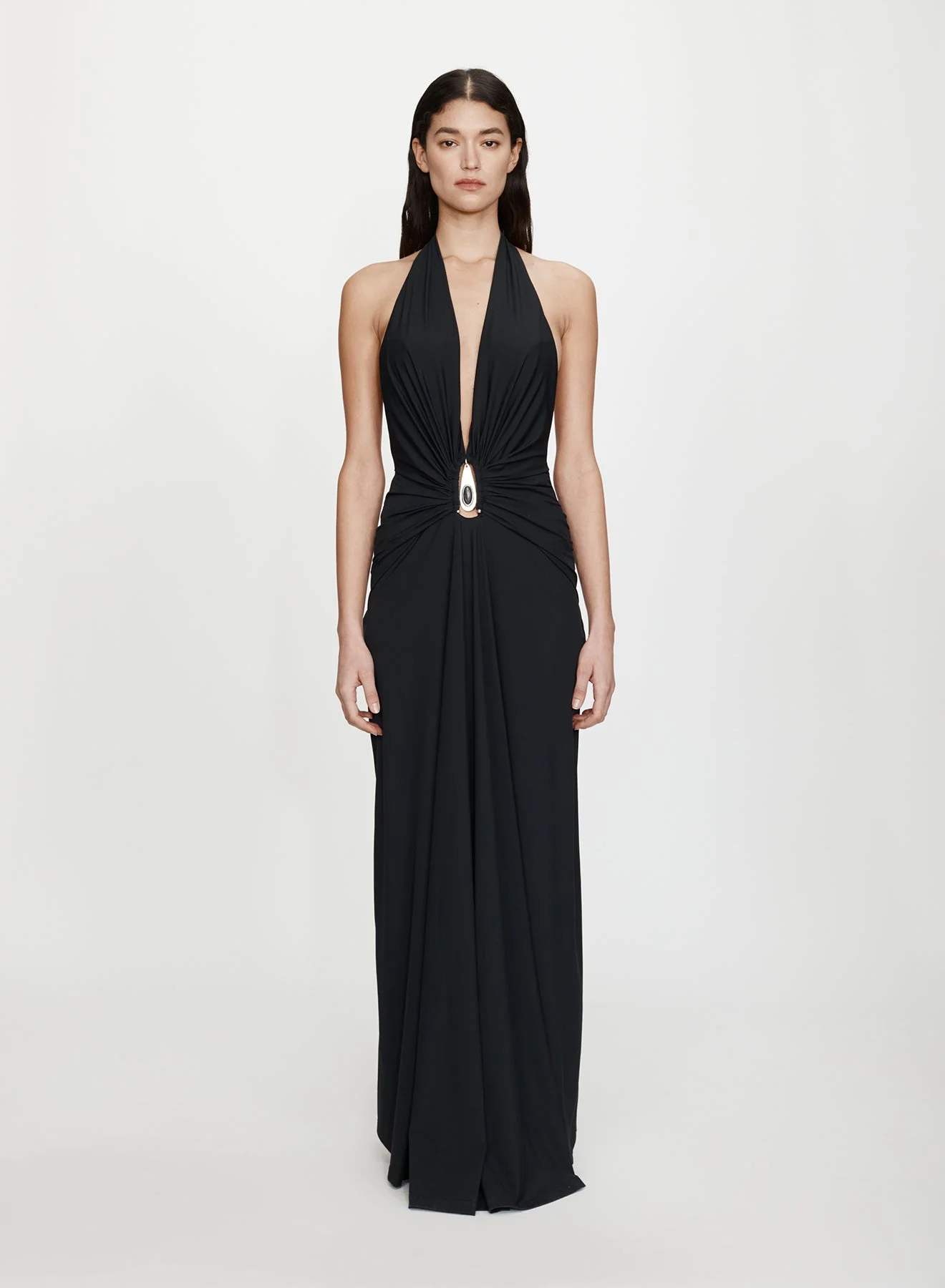 The Crystal Pendant Ruched Halter Dress is cut from matte stretch lycra, designed with a plunging neckline that gathers into a central crystal pendant. The fluid silhouette falls from the waist into a soft column skirt, balanced by an open back and full length hemline. Style with minimal heels and fine jewellery for refined evening wear. - Plunging halter neckline - Central crystal pendant with brass setting - Gathered waist detailing - Open back - Full-length column silhouette - Matte stretch lycra fabrication - Main: 72% Polyamide, 28% Elastane - Hardware: 100% Zinc Alloy Brass with Stone Model is 180cm/5'11" and wears size AU 8 (US 4) AU sizing
