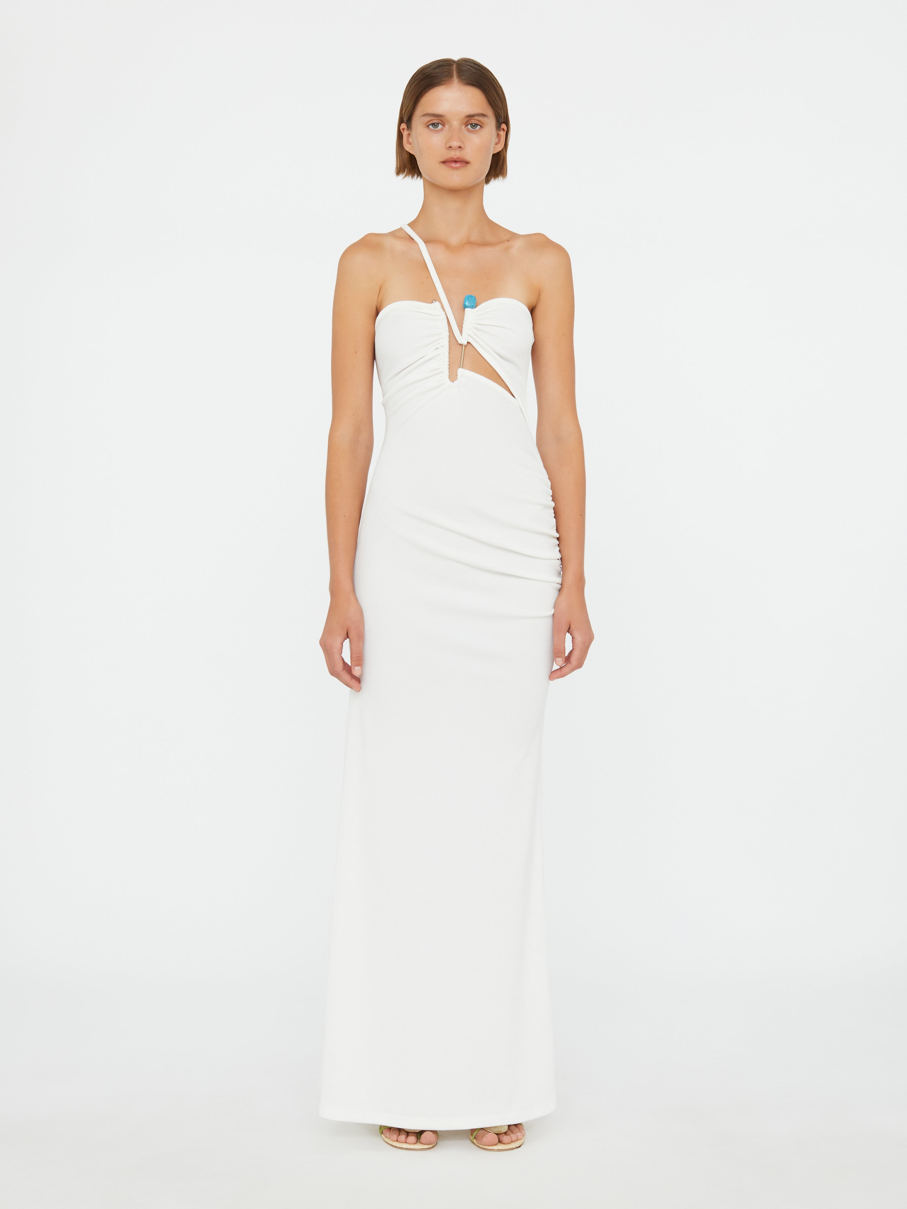 A directional take on evening dressing, the Crystal Pin Cutaway Cami Dress features a single strap silhouette with a sculpted bodice and underbust cutout. Signature Christopher Esber stone hardware detail punctuates the neckline. Finished with a fitted waist and maxi column skirt to elongate the form. - Full-length maxi silhouette - Single asymmetric shoulder strap - Sculpted bodice with gathered detailing - Underbust cutout feature - Signature natural stone hardware detail - Main: 96% Polyester, 4% Spandex - Hardware: 100% Copper with Natural Stone - Dry Clean Only Model is 180cm/5'11" and wears size AU 8 (US 4) AU sizing