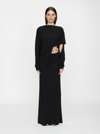 Crafted in slinky viscose jersey, the Encased Nature Resin Draped Jersey Dress features sculptural draping across the body and a relaxed long-sleeve silhouette. A cutout at the waist reveals the torso, anchored by clear resin hardware encasing preserved maidenhair fern. Gathering through the hip creates soft structure, while the elongated skirt falls clean to the floor. - Full-length silhouette - Draped jersey bodice with long sleeves - Cutout at waist - Resin droplet hardware - Encased maidenhair fern detailing - Soft ruching through hip - Main: 100% Viscose - Hardware: 100% Resin - Dry Clean Only Model is 180cm / 5'11" and wears size AU 8 (US 4) AU sizing