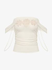 A strapless cami in ribbed jersey, detailed with hibiscus embroidery across the foldover neckline. The slim silhouette is framed with draped ties at each side, designed to be worn long or softly knotted. Style with leather tailoring or layered beneath soft outerwear. - Strapless cami in ribbed jersey - Foldover neckline with hibiscus embroidery - Slim fit with draped side ties - Pull-on style - Main: 95% Viscose, 5% Elastane Model is 179cm/5’10.5” and wears size AU 8 (US 4) AU sizing