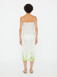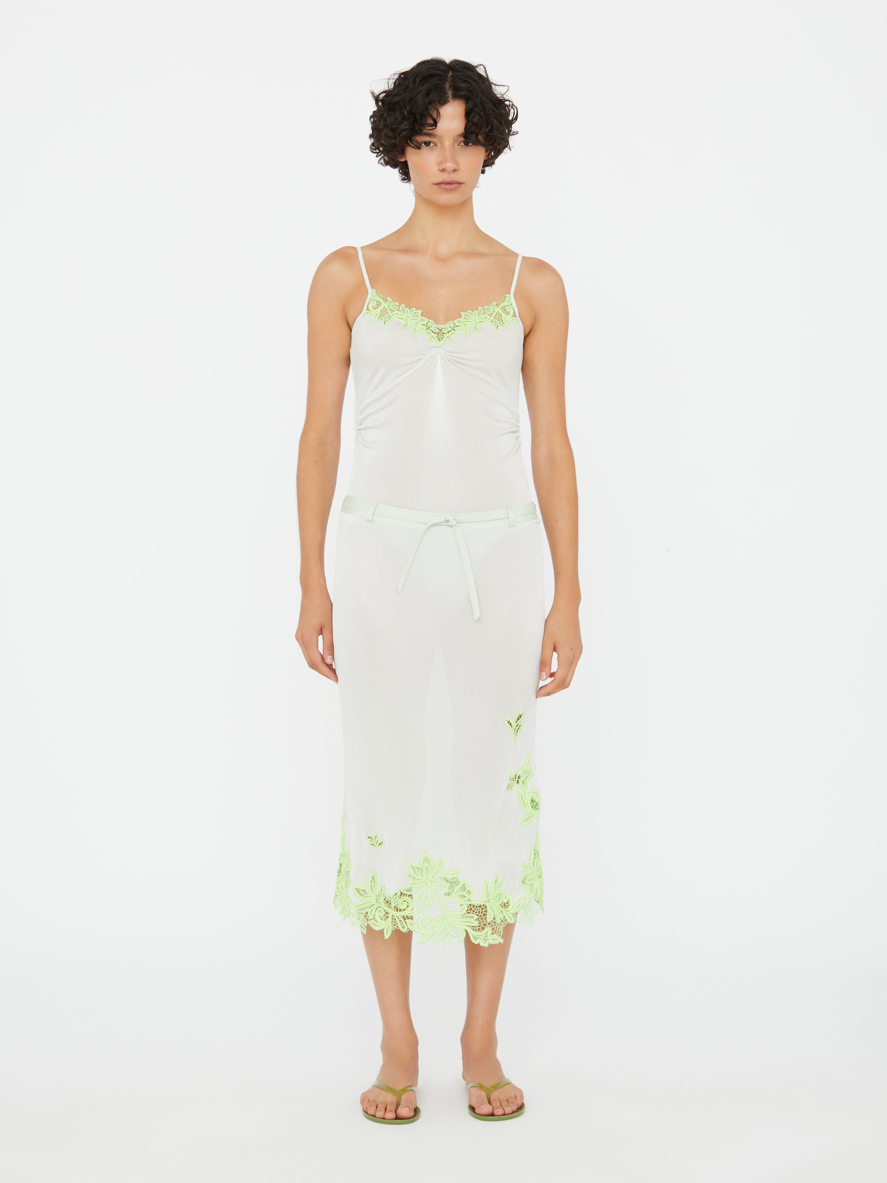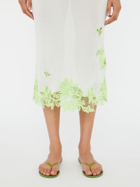 A sheer knit midi skirt featuring contrast floral embroidery along the hemline. Cut to a straight silhouette with soft stretch and finished with a minimal self-tie belt, the piece blends delicacy with structure through restrained detail. Layer over tonal briefs or contrast swim for a modern resort interpretation. - Sheer knit midi skirt with embroidered hem - Contrast floral embroidery in tonal thread - Straight cut with soft drape - Self-tie waistband belt - Pull-on style - Unlined - Main: 95% Viscose, 5% Elastane - Trim: 100% Polyester Model is 180cm/5'11" and wears size AU 8 (US 4) AU sizing