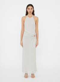 Sculptural Imber hardware pierces silk noil and wool bonded constructions for elevated resortwear dressing. Defined by a subtle metallic finish, the Imber Metallic Looped Skirt is crafted to a full-length silhouette. Gathering at the hip draws the eye to a considered cut-out anchored by sculptural copper hardware. Designed for a streamlined silhouette that sits neatly on the waist and falls straight to the ankle. - Subtle metallic finish throughout - Sculptural Imber hardware - Wire loop cut-out detail - Full-length silhouette - Main: 64% Viscose 20% Polyamide 16% Polyester - Contrast: 90% Polyamide 10% Elastane - Hardware: 100% Copper - Dry Clean Only Model is 180cm/5'11" and wears size AU 8 (US 4) AU sizing