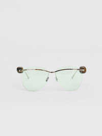 A sculptural take on the classic aviator, oversized lenses are suspended from a sleek metal brow bar and fine rim structure. The temples are finished with signature Christopher Esber stone hardware. - Frame: 94% Stainless Steel, 3% Nickel Silver, 2% Monel, 1% Titanium - Lens: 100% Nylon - Metal Frame - Acetate Tips - Ultramarine gradient coloured lense - International fit - Wipe clean with a soft, dry cloth