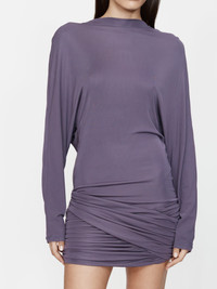 Cut from a soft, stretch-infused jersey, the design skims the form with ease, balancing sensuality and restraint in equal measure. The Luna Draped Jersey MIni Dress features asymmetric gathering through the skirt and sleeves, contrasted by a plunging, low cowl back. - Mini length with asymmetric draping - Boat neckline with full-length sleeves - Draped cowl back with deep plunge - Gathered detail through the skirt - Stretch jersey for a close, fluid fit - Main: 100% Viscose Model is 180cm/5'11" and wears size AU 8 (US 4) AU sizing