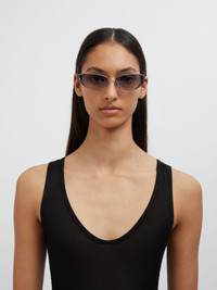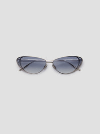 The upswept shaped eyewear that debuts this season is an extension of our classic hardware. A formed counterweighted temple tip compliments the floating cut out structured temple with nose metals. - Frame: 94% Stainless Steel, 3%Nickel Silver, 2%Monel, 1% Titanium Lens: 100% Nylon - Metal Frame - Acetate Tips - Ultramarine gradient coloured lense