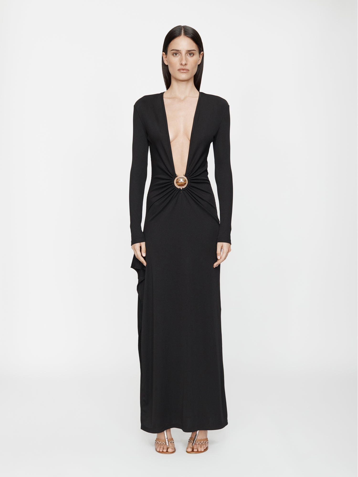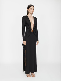 Cut in a fine rib jersey, the Mineral Stone Cascade Long Sleeve Dress features a deep V neckline, gathered draping through the waist and a circular hardware accent at the centre front. A domed mineral stone is set in gold-toned hardware, anchoring the silhouette with sculptural weight. - Deep plunge neckline - Gathered drape through the waist - Long sleeves and floor-length silhouette - Signature hardware with domed mineral stone - Slim fit design - Lightweight ribbed jersey with natural stretch - Main: 96% Polyester 4% Spandex - Hardware: 100% Brass with Natural Stone Model is 179cm/5'10.5" and wears size AU 8 (US 4) AU sizing