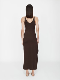 The Mineral Stone Cascade Tank Dress is defined by two oversized tiger’s eye resin rings, sculptural hardware anchoring the draped silhouette with calculated asymmetry. Cut from compact rib for structure and softness, deep V neckline and hip-high cutaway, framed by the natural curvature of the body. - Deep plunge neckline - Gathered drape through the waist - Long sleeves and floor-length silhouette - Signature hardware with domed mineral stone - Slim fit design - Lightweight ribbed jersey with natural stretch - Main: 96% Polyester 4% Spandex - Hardware: 100% Brass with Natural Stone Model is 179cm/5'10.5" and wears size AU 8 (US 4) AU sizing