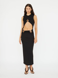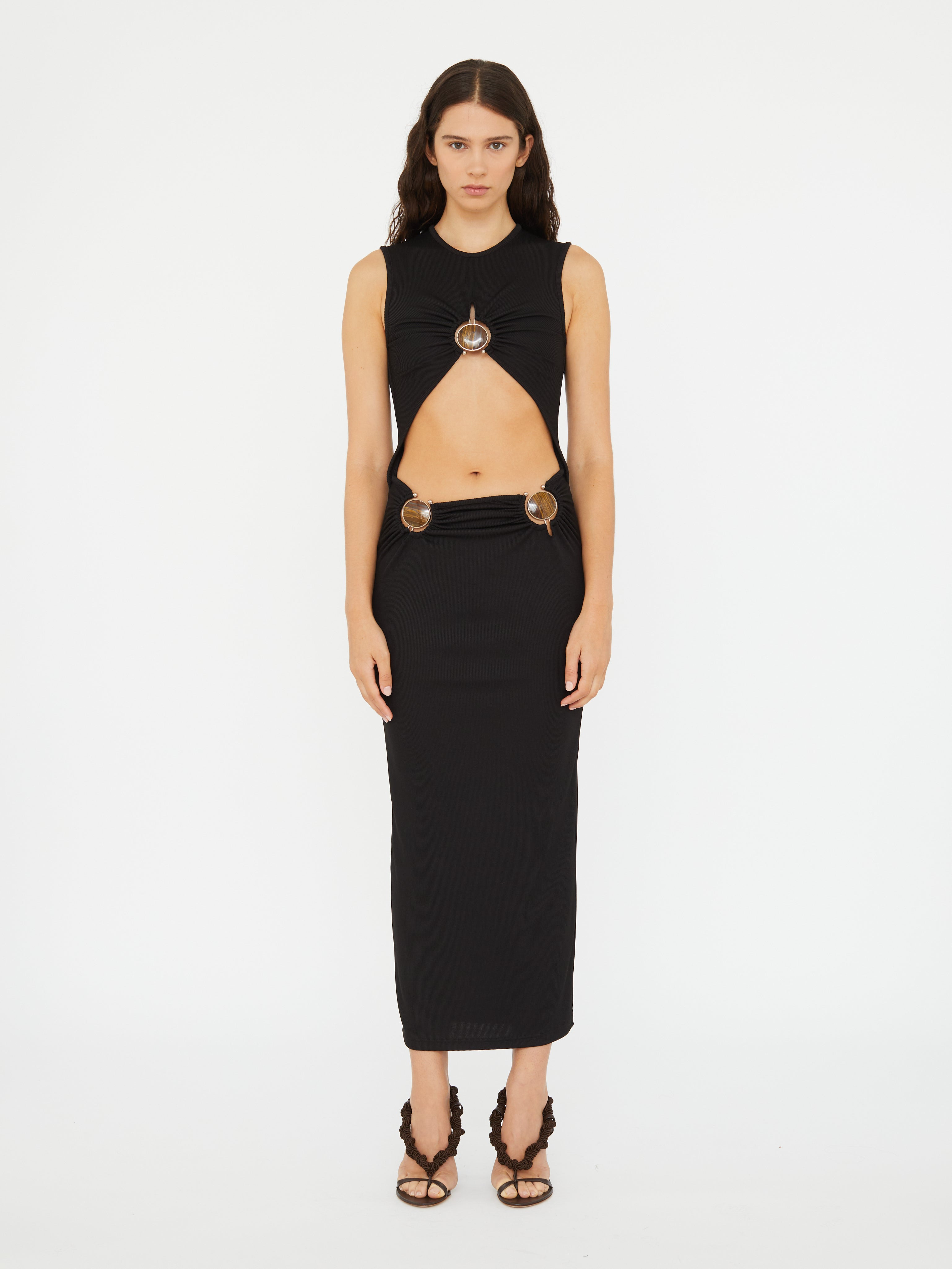 The Mineral Stone Cascade Tank Dress is defined by two oversized tiger’s eye resin rings, sculptural hardware anchoring the draped silhouette with calculated asymmetry. Cut from compact rib for structure and softness, deep V neckline and hip-high cutaway, framed by the natural curvature of the body. - Deep plunge neckline - Gathered drape through the waist - Long sleeves and floor-length silhouette - Signature hardware with domed mineral stone - Slim fit design - Lightweight ribbed jersey with natural stretch - Main: 96% Polyester 4% Spandex - Hardware: 100% Brass with Natural Stone Model is 179cm/5'10.5" and wears size AU 8 (US 4) AU sizing