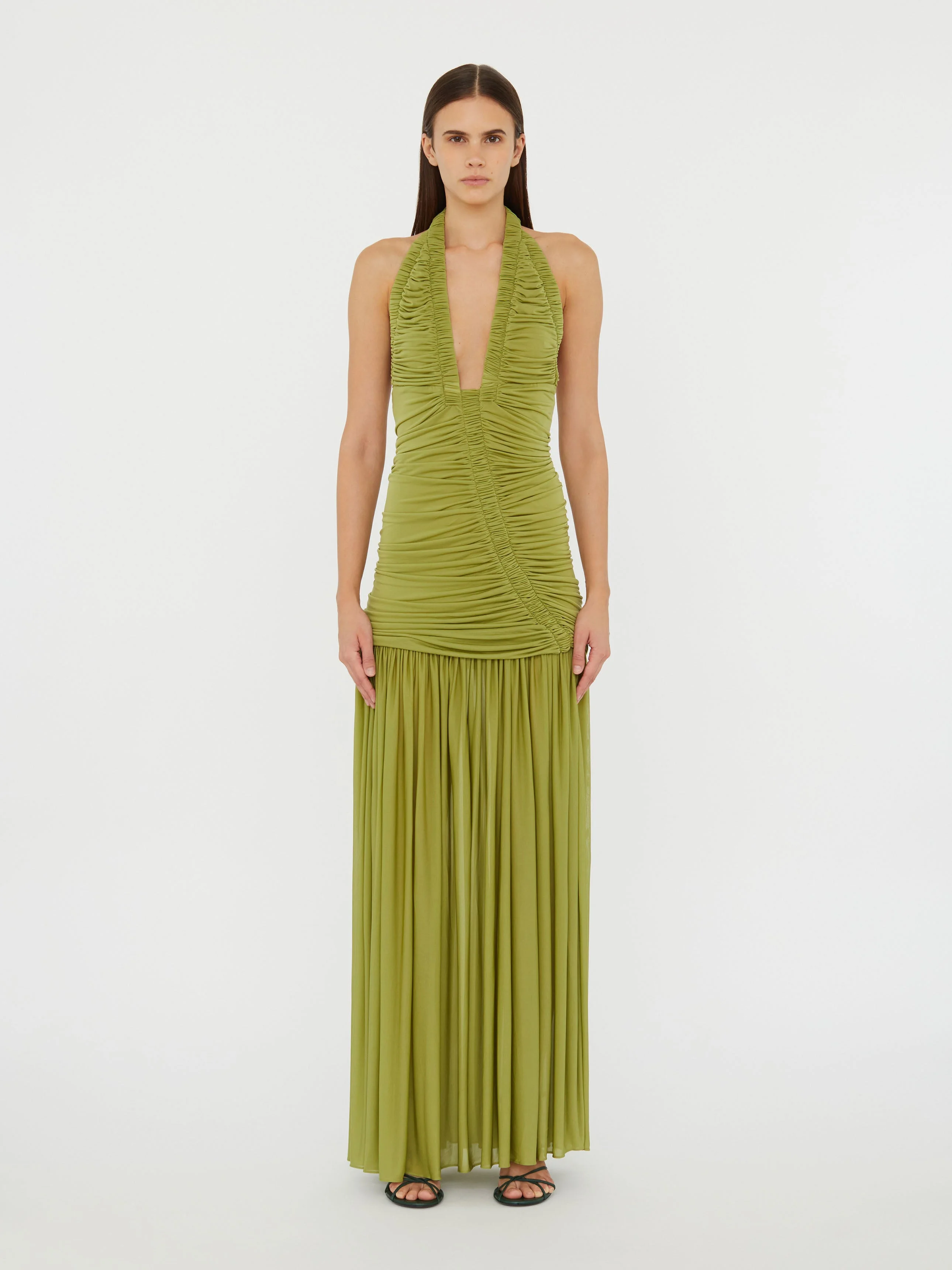 Grafted with free forming line, this richly textured gown is animated by hand sculpted pleats that trace its plunging v neckline and racerback straps. - Plunging V neckline - Racerback inspired halter straps - Hand sculpted ruching - Drop-waist maxi silhouette - Pleated full skirt - Fitted bodice - True to size - 71% Rayon 29% Polyester Model wears size AU 8 (US 4) AU sizing