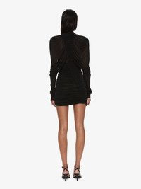 An evolution of the signature Orion line, the Orion Micro Dress is defined by sculpted ruching that shapes the plunging neckline and draws into a contoured, body-skimming silhouette. Long, gauze-like sleeves fall from the shoulder in soft drape, balanced by a gathered mini length that creates subtle volume and textural depth. Style with minimal heels for after-dark refinement. - Deep V neckline with gathered framing - Sculpted ruching through the bodice - Long sheer sleeves with fluid drape - Contoured mini silhouette - Pull-on construction - True to size - Main: 71% Rayon 29% Polyester Model is 180cm/5'11" and wears size AU 8 (US 4) AU sizing