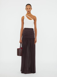 The Orion Skirt is crafted in fluid jersey, gathered at the hip before falling into cascading pleats. Designed with a ruched waistband for definition, the floor-length silhouette balances structure with movement. Style with a minimal tank or sheer layers for considered contrast. - Floor-length skirt in fluid jersey - Ruched waistband with gathered detail - Draped pleats for fluid movement - Pull-on style with elasticated waist - Main: 71% Rayon 29% Polyester - Dry Clean Only Model is 179cm/5’10.5” and wears size AU 8 (US 4) AU sizing