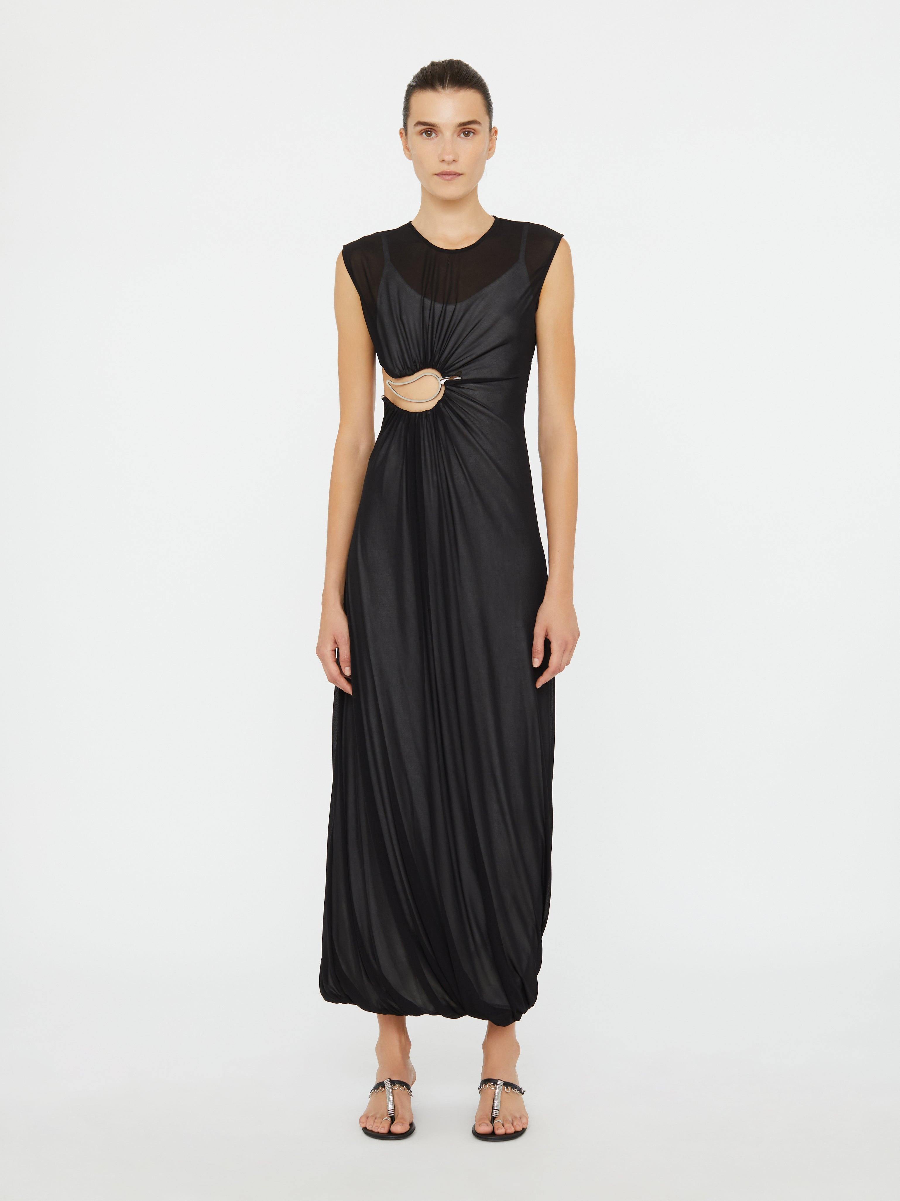 The Paisley Overlay Encased Tank Dress features a fluid maxi silhouette with a bubble hem and sculptural side cutout. The body is softly draped and drawn toward a single curved opening, framed by signature metal paisley hardware. A sheer mesh yoke adds contrast and coverage, while directional ruching enhances movement. - Sleeveless maxi silhouette - Soft stretch jersey fabrication - Sheer mesh yoke detail - Sculptural side cutout detail - Signature metal paisley hardware - Directional ruching through the body - Gathered draping at the hem - Main: 96% Polyester 4% Spandex - Hardware: 100% Copper - Dry Clean Only Model is 180cm/5'11" and wears size AU 8 (US 4) AU sizing