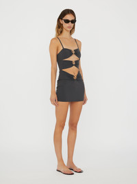 Sculptural orbit hardware pierces matte lycra for elevated poolside dressing. This cut-out front mini dress is ruched at the centre and features signature orb hardware. - Signature brass orb hardware - Adjustable straps - Multiple cut outs - True to size with a close fit - Mini dress silhouette - Matte finish - Stretch lycra fabrication - Main: 72% Polyamide 28% Elastane, Hardware: 100% Brass Am√©lie is 180cm/511‚Au and wears size AU 8 (US 4) AU sizing