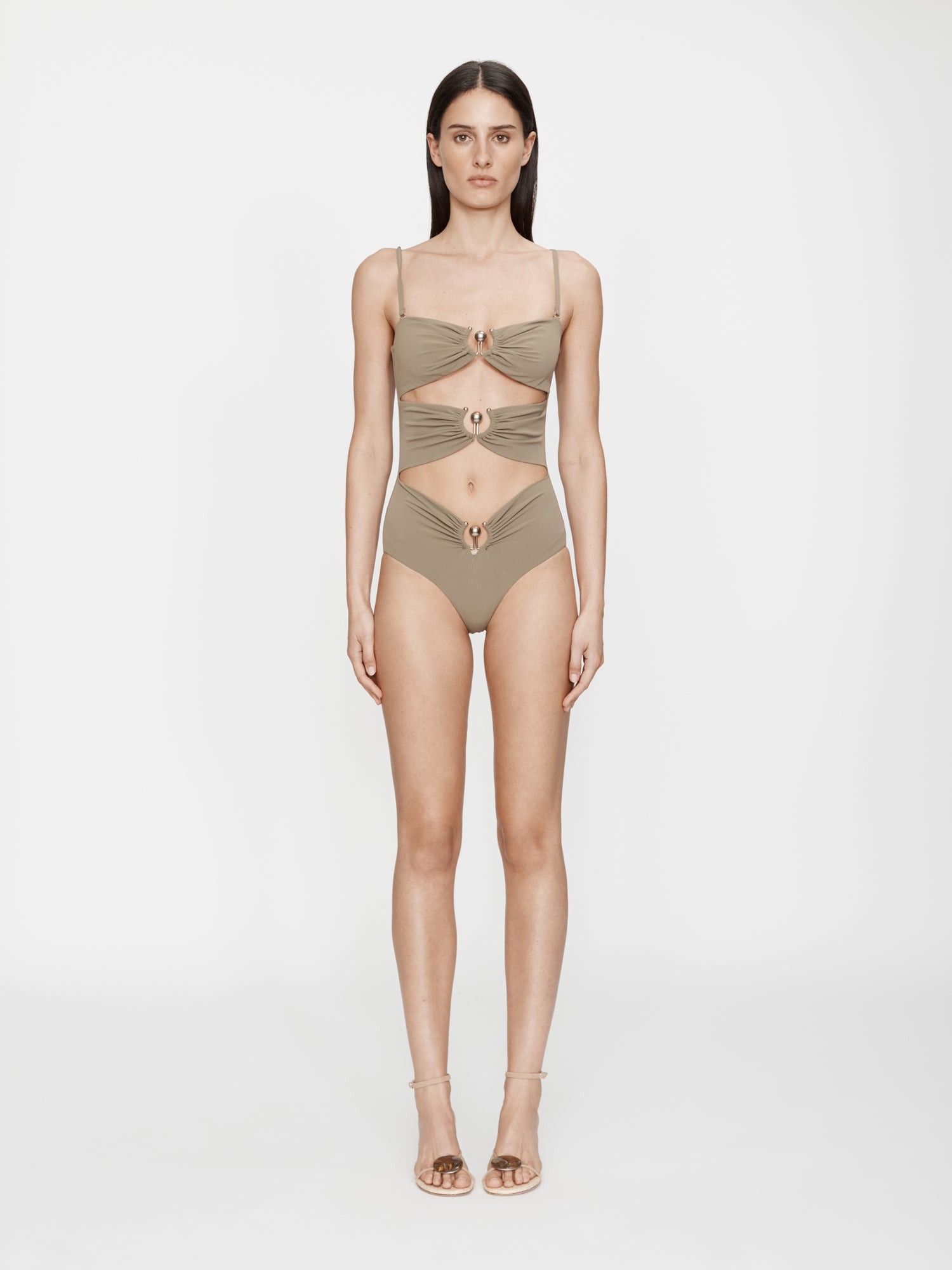 Sculptural orbit hardware pierces matte lycra for elevated poolside dressing. This cut-out front one piece is ruched at the centre and features signature orb hardware. - Signature brass orb hardware - Adjustable straps - Multiple cut outs - True to size with a close fit - Matte finish - Stretch lycra fabrication - Mains: 72% Polyamide 28% Elastane, Hardware: 100% Brass Model is 180cm/5'11" and wears size AU 8 (US 4) AU sizing