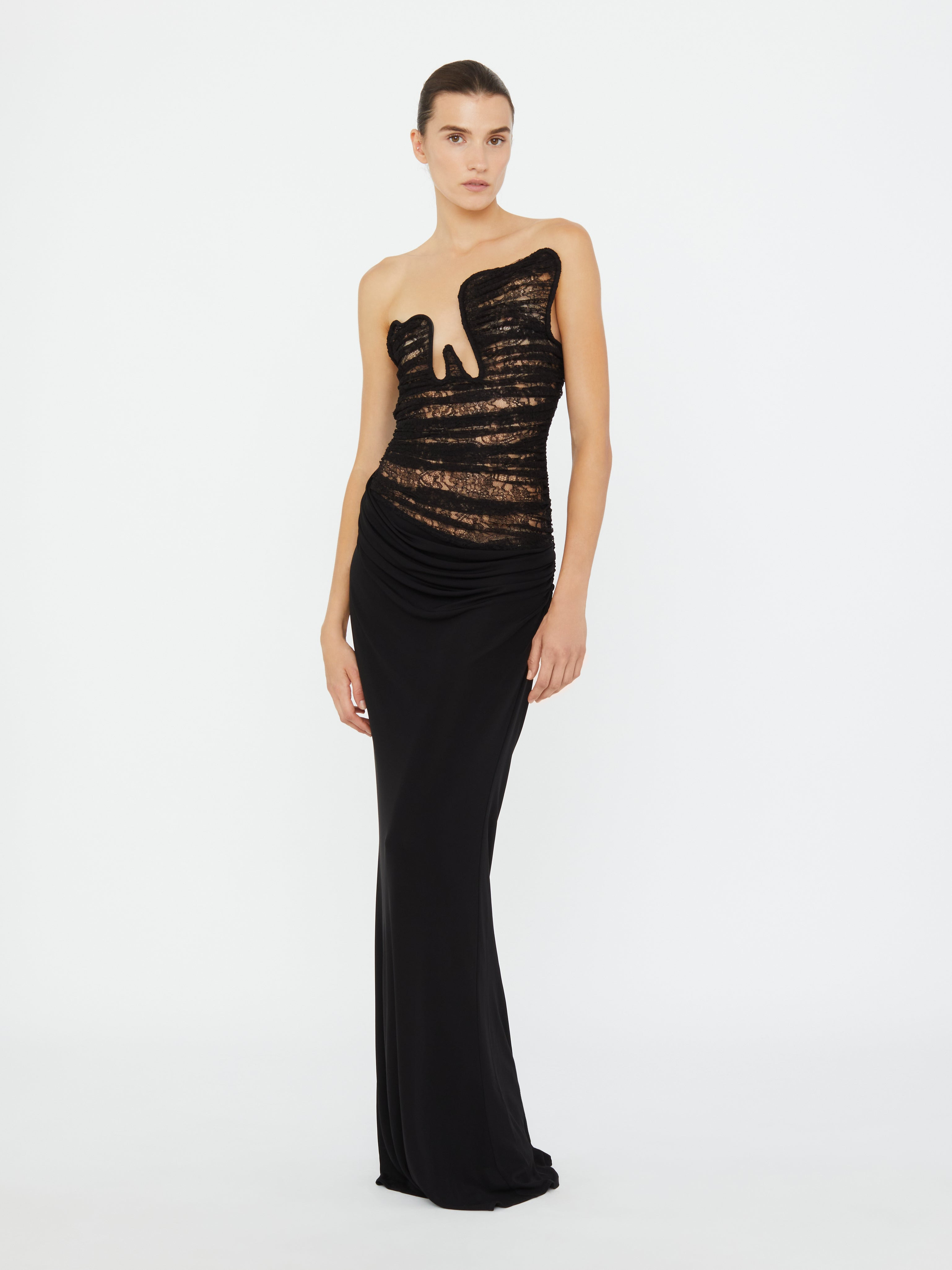 A strapless evening gown featuring a sculptural lace bodice, traced with an organic neckline and sheer paneling. The bodice is reinforced with internal structure and framed by delicate copper wiring, while a gathered hip seam releases into a fluid, floor-length skirt. Both directional and refined, the silhouette fuses softness with architectural control. Style with tonal heels and sculptural jewellery for after-dark clarity. - Strapless gown with sculptural lace bodice - Sheer lace paneling with internal corset structure - Organic neckline with custom copper wiring - Draped hip detailing into a column skirt - Invisible zip closure at side - Bodice: 37% Viscose, 40% Polyamide, 23% Elastane - Skirt: 100% Viscose - Lining: 100% Silk - Hardware: 100% Copper - Dry Clean Only Model is 180cm/5'11" and wears size AU 8 (US 4) AU sizing