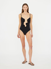 The Salacia One Piece brings an iconic silhouette to swimwear for the first time, seamlessly blending Esber‚Aos signature design codes with functionality. Crafted in matte lycra, t his once piece swimsuit is finished signature wire cut-out and¬†with pearlescent hardware. - Sculpted wire wave formation hardware - One piece swimsuit - True to size with a close fit - Matte finish - Stretch lycra fabrication - Mains: 72% Polyamide 28% Elastane, Hardware: 100% Brass Claire is 179cm/5'11" and wears size AU 8 (US 4) AU sizing