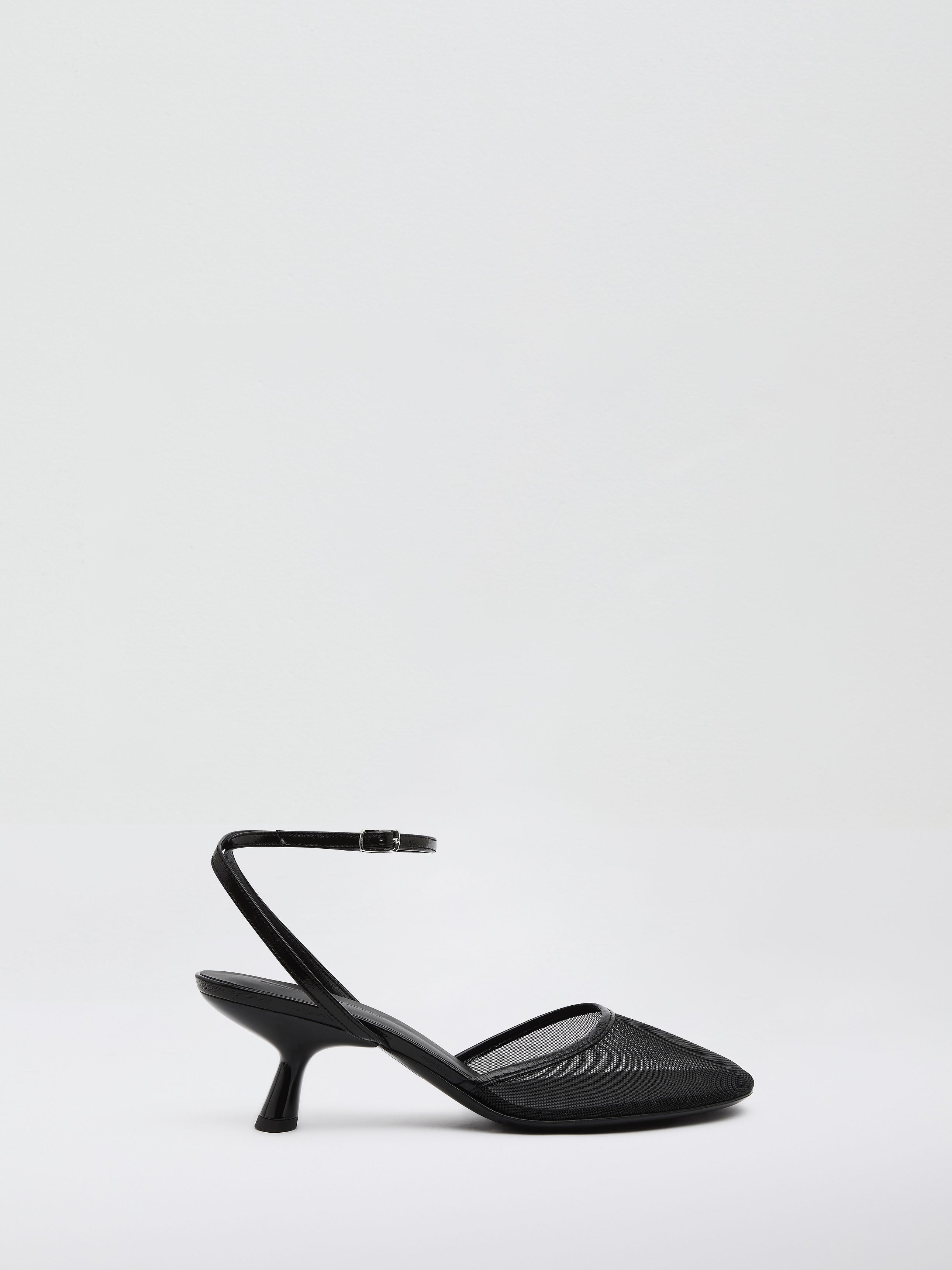 A dimensional sheer mesh heel shaped by softened lines. Taking cue from the classic mary-jane silhouette, its rounded toe is traced with patent leather trims. - Crafted in Italy - Heel Height: 75mm - Mesh netting with patent leather trim - Buckle-fastening cross ankle straps - Upper: 100% Nylon - Trim: 100% Leather Calf - Lining: 100% Leather Cow Nappa - Sole: 100% Leather Cow Footwear is in IT sizing