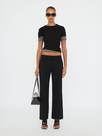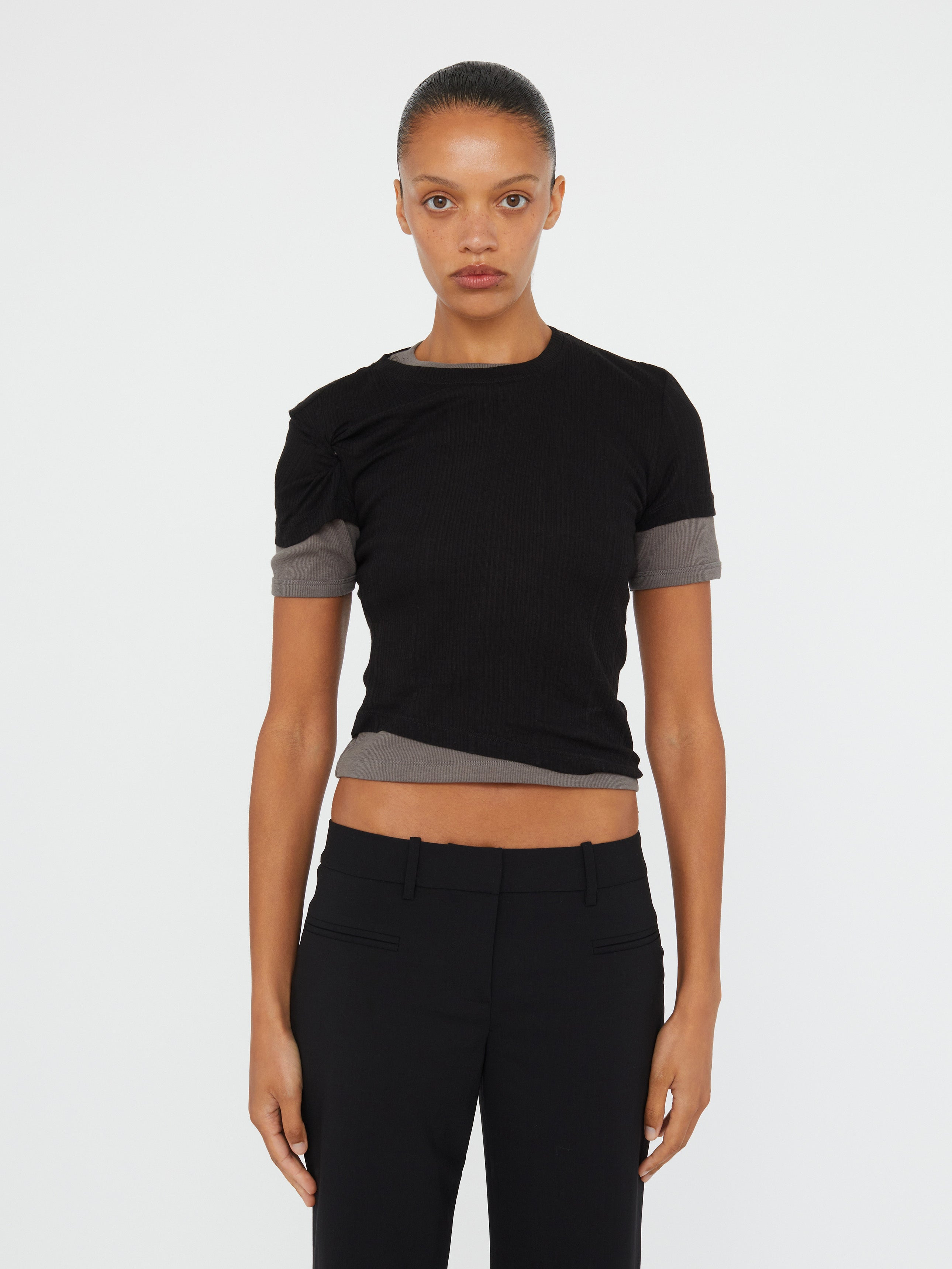 A palette of tones is explored with this sheer layered short sleeve rib tee. Contrasting depths of shadow grey and black are layered and revealed from beneath, finished with tuck detailing at the sleeve. - Contrast cotton rib under-layer - Cotton rib outer-layer - High round neckline - Peephole cut out - Gently ruched side seams - Cropped at the waist - High round neckline - 100% Cotton Lining - Contrast Outer: 95% Cotton 5% Elastane Kukua is 176cm/59.5" and wears size AU 8 (US 4) AU Sizing