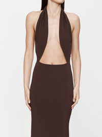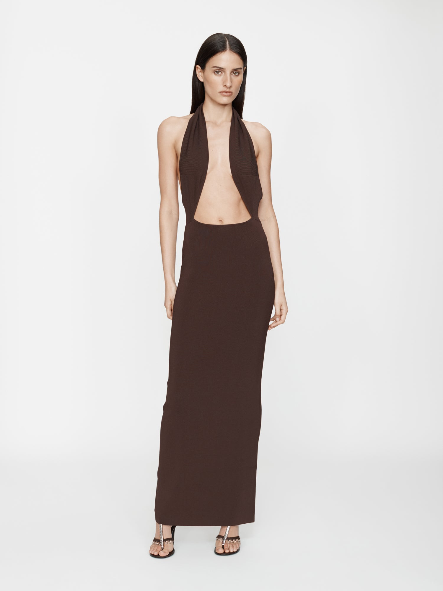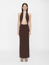 Crafted from technical ribbed knit, designed to trace the form while offering natural stretch. Defined by its sculptural halter neckline and open torso, the column silhouette is balanced by a high waist and floor-grazing hemline. Style with minimal heels for occasion dressing. - Compact rib knit for soft structure and stretch - Curved waistband - Crew neckline with full-length sleeves - Designed to pair with the matching cutaway skirt - Pull-on style - Main: 80% Viscose 20% Nylon Model is 179cm/5'10.5" and wears size AU 8 (US 4) AU sizing