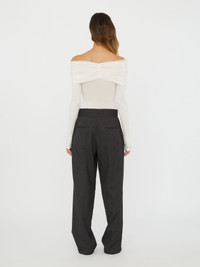 Evolved from the brands signature Veiled Top. This ribbed off the shoulder long sleeve top is wrapped in a sheath of transparent silk tulle. - Sheer stretch silk tulle - Lightweight ribbed base - Fold down shawl for multi wear - Off the shoulder - True to size - Main: 97% Viscose 3% Elastane - Outer Veil: 100% Silk Lucianne is 177cm/5'9” & wears size AU 6 (US 2) AU sizing